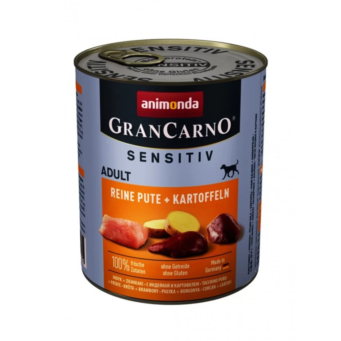 Animonda Gran Carno Sensitive - Храна за чувствителни кучета с пуешко месо и картофи. GranCarno® Sensitive е натурална храна за чувствителни кучета.Под въздейсвтие на факторите на градската среда все повече кучета стават чувствителни към състава на храните. Затова GranCarno® Sensitiv е приготвена само с един източник на протеин (само пиле, говеждо, агнешко или пуйка) или в комбинация с лесно смилаеми картофи (без глутен), за да подпомогне храносмилането при нашите домашни любимци. Направена е от свежи съставки като сготвени месо, сърца и черен дроб.Кучетата безпогрешно разпознават истинския вкус на месо в GranCarno® Sensitiv.Предлага се в разфасовки от 200, 400 и 800 гр. Остатъкът до 100% е бульон, който е необходим при готвенето на храната.