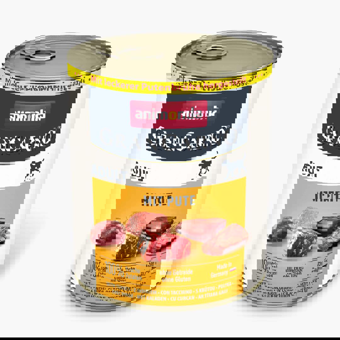Animonda Gran Carno Sensitive - Храна за чувствителни кучета с пуешко месо и картофи. GranCarno® Sensitive е натурална храна за чувствителни кучета.Под въздейсвтие на факторите на градската среда все повече кучета стават чувствителни към състава на храните. Затова GranCarno® Sensitiv е приготвена само с един източник на протеин (само пиле, говеждо, агнешко или пуйка) или в комбинация с лесно смилаеми картофи (без глутен), за да подпомогне храносмилането при нашите домашни любимци. Направена е от свежи съставки като сготвени месо, сърца и черен дроб.Кучетата безпогрешно разпознават истинския вкус на месо в GranCarno® Sensitiv.Предлага се в разфасовки от 200, 400 и 800 гр. Остатъкът до 100% е бульон, който е необходим при готвенето на храната.