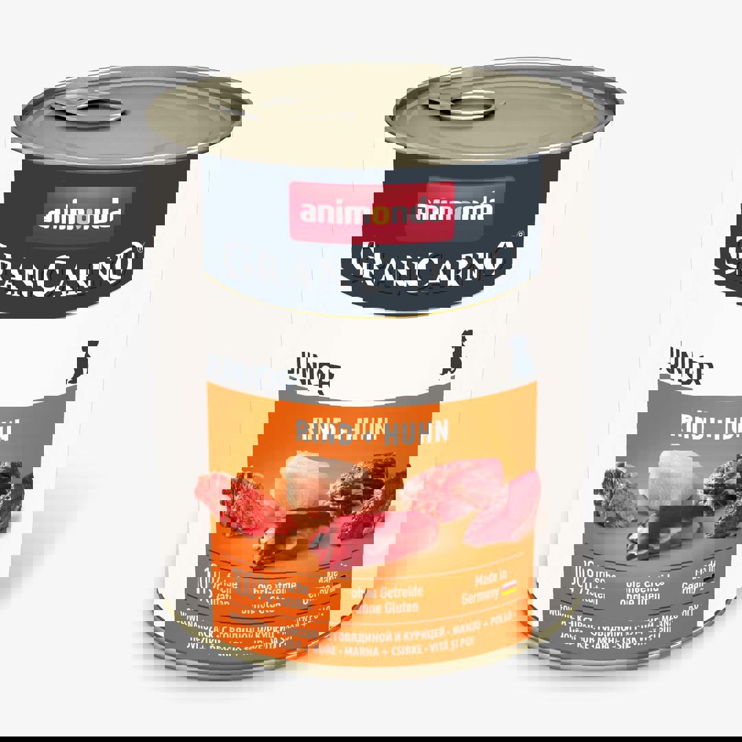 GranCarno Original Junior with Chicken and Beef - пилешко и говеждо месо, за кучета от 1 до 12 месеца. Линията GranCarno Junior е разработена от Animonda GmbH, Германия. Те е предназначена специално за вашите млади четирикраки приятели - за дребни породи до 8-12 месеца, средни породи до 12-18 месеца, едри и гигантски породи до 18-24 месеца. Предлага се в опаковка от 400 или 800 гр в два различни вкуса:GranCarno® Junior пиле и говеждоGranCarno® Junior говеждо + пуешки сърца.Храните от линията GranCarno Junior са от 100 % прясно месо без месокостно брашно, кожи и други отпадъци, обикновено замаскирани в съдържанието като "субпродукти". Не съдържат соя, захар, оцветители, овкусители и консерванти.GranCarno придружава вашето куче във всеки стадий от живота му. GranCarno® Junior е за малки кученца, GranCarno® Adult - за израснали кучета, и GranCarno® Senior - за кучета над седем години. Специалната селекция от прясно месо за всяка серия Animonda GranCarno®, минералното съдържание и размерът на храната са съобразени с възрастта на кучето. Продуктите съдържат чисто прясно месо без никакви добавки, оцветители и консерванти. Типичната структура на месото е напълно запазена и това може ясно да се види, а вкусът е истински и неповторим, което кучето цени повече от всичко. ************************************************************************Animonda – Голямото име на деликатесна храна за домашни любимциЗа много хора домашните любимци са част от семейството със статус на най-добър приятел. В продължение на три поколения компанията Stockmeyer Verwaltung AG израства до един от водещите немски производители на висококачествено месо и месни деликатеси за хора. Част от този концерн е и Animonda GmbH, която има за цел благополучието на нашите домашни любимци, като насочва своите проучвания, производство и маркетинг към висококачествените храни за котки и кучета.Продуктът е специално създаден от любители на животните, за които качеството на живот и добруването на домашните любимци е от изключително значение. Затова те са създали рецепти, с които да осигурят на своите любимци качествено хранене, като част от качественото съществуване.Жизненост и здраве от купата за храненеВсички продукти са създадени в съответствие с най-новите научни открития, засягащи здравето и чувствителността на животните. Затова са натурални, свежи и без абсолютно никакви неразрешени оцветители. Подбраните свежи съставки се подготвят толкова внимателно, че техните жизнени съставки остават почти непроменени. Гарантираме, че надписът върху опаковката наистина отговаря на съдържанието. В разнообразната и добре балансирана програма на хранене на Animonda продуктите са така създадени, че да отговарят на специфичните изисквания на животните - възраст, тегло, активност, както и специални изисквания или обстоятелства като алергии, непоносимости или метаболични проблеми. Освен това сме развили и специални диети за домашни животни, страдащи от специфични проблеми.Експерти по храната за домашни любимци ежедневно проверяват качеството. Процесът на производство е сертифициран съгласно стандарта за качество ISO 9001. Постоянно е под вътрешен и външен контрол и подлежи на внимателно научно наблюдение. В развитието на продуктите ветеринарите и експертите по хранене в Animonda си взаимодействат с водещи немски и европейски университети. Също така голям принос имат и развъдниците, любителите на домашни животни и широкото ноухау в производството на хран