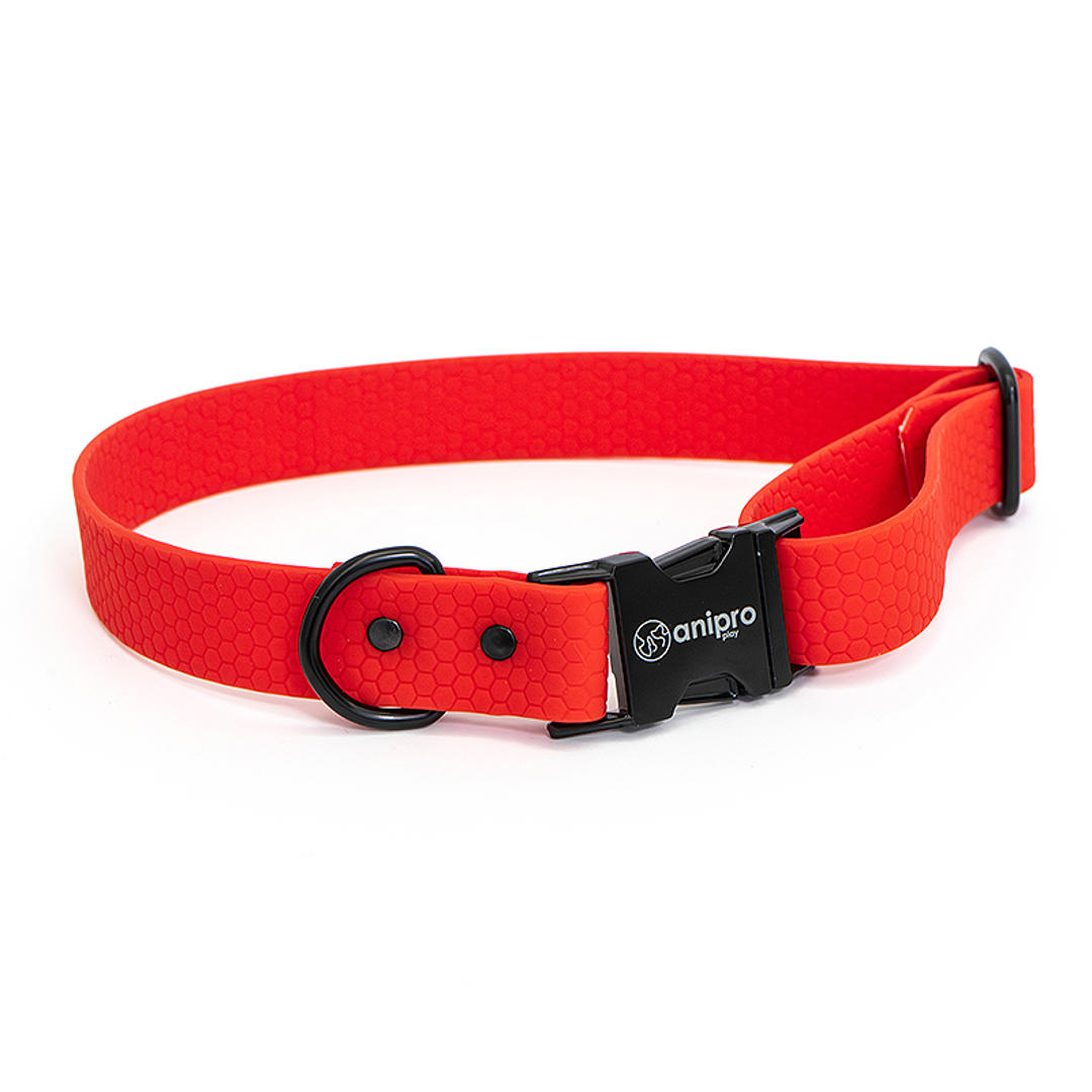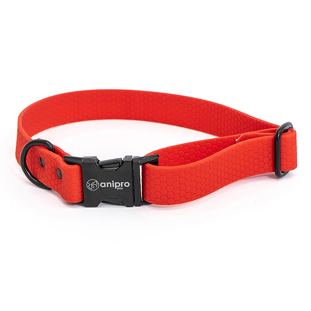 Anipro Hexagon - Регулируем нашийник за кучета, водоустойчива лента хексагон 25мм/35-55см червен с тока розово злато Нашийниците anipro Hexagon са направени от водоустойчива полипропиленова лента с шарка на пчелна пита (шестоъгълна) от двете страни и с PVC покритие. Тя е много по-издръжливa от обикновената полипропиленова лента. Устойчива е на абразия, 100% водоустойчива, антибактериална и не се разтяга.