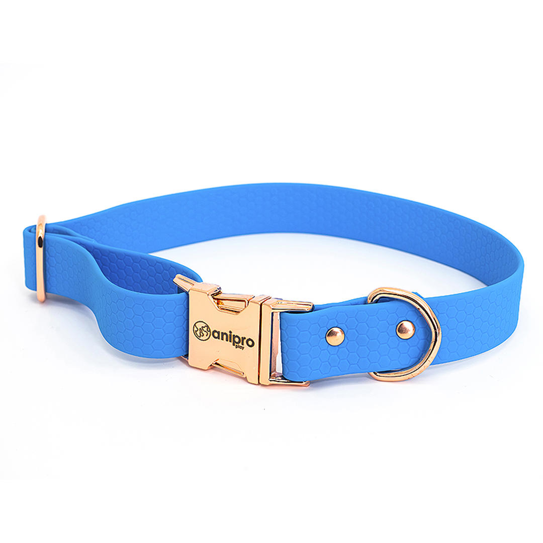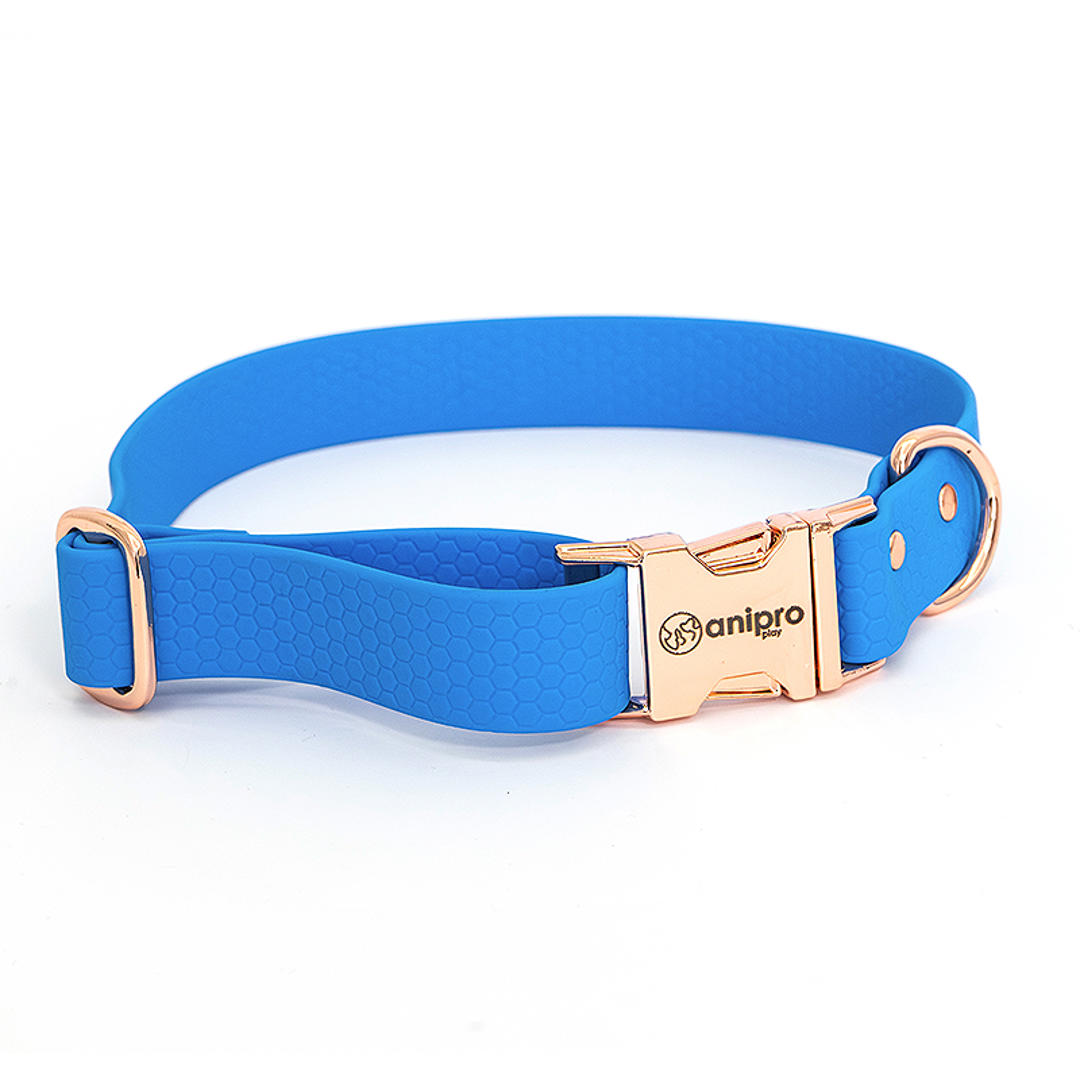 Anipro Hexagon - Регулируем нашийник за кучета, водоустойчива лента хексагон 25мм/35-55см, светло син с тока розово злато Нашийниците anipro Hexagon са направени от водоустойчива полипропиленова лента с шарка на пчелна пита (шестоъгълна) от двете страни и с PVC покритие. Тя е много по-издръжливa от обикновената полипропиленова лента. Устойчива е на абразия, 100% водоустойчива, антибактериална и не се разтяга.