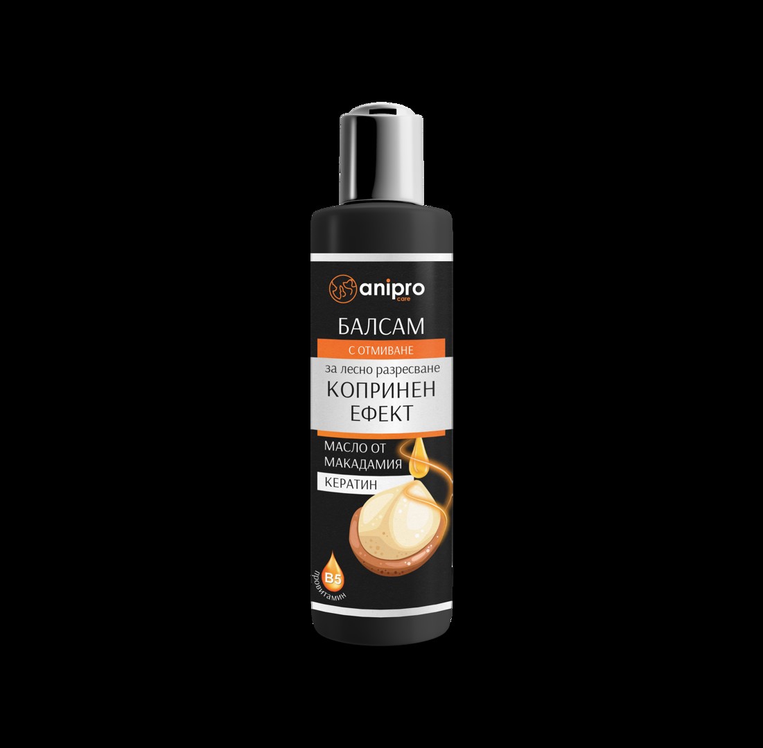 Anipro Lux - Шампоан за кучета с копринен ефект за лесно разресване, 200 мл. anipro Lux шампоан за куче, копринен ефект е луксозен шампоан за лесно разресване. Съдържа мощна комбинация от интензивно възстановяващи косъма съставки. Натуралното масло от Макадамия подсилва и заглажда косъма. Провитамин В5 допълнително подхранва косъма по цялата дължина. Козината е здрава, лъскава и лесна за разресване. Кучето се чувства по-комфортно.