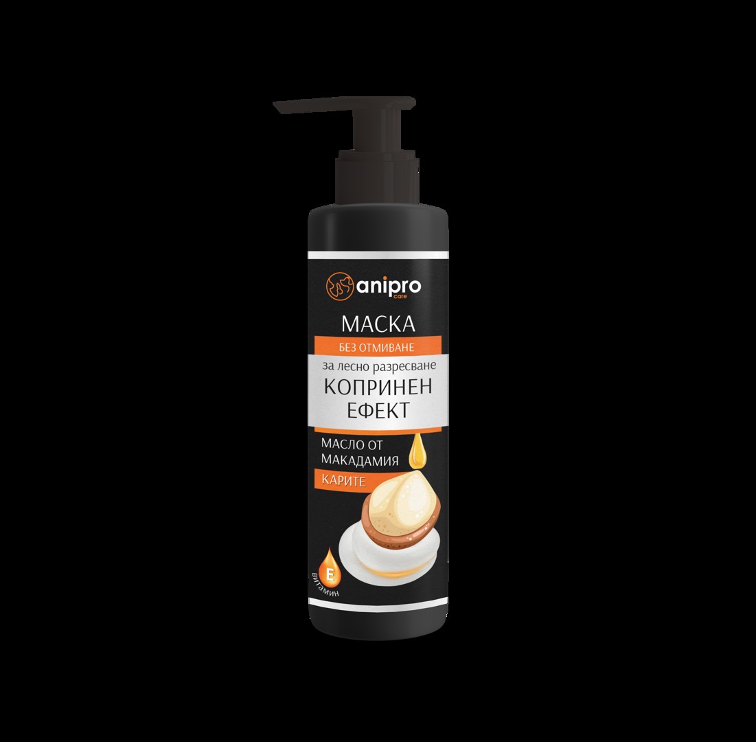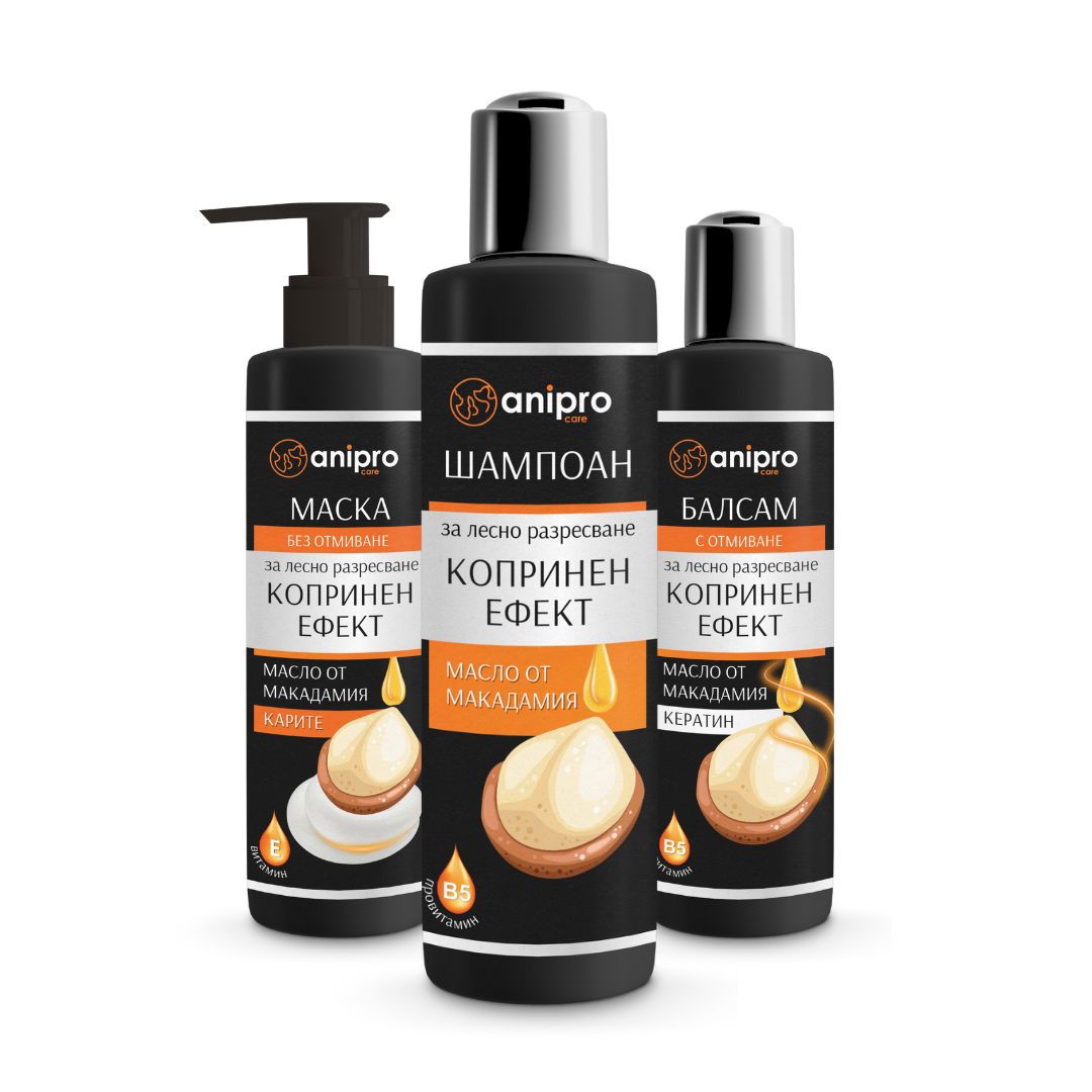 Anipro Care - Шампоан за кучета с копринен ефект за лесно разресване, 200 мл. anipro Care шампоан за куче, копринен ефект е луксозен шампоан за лесно разресване. Съдържа мощна комбинация от интензивно възстановяващи косъма съставки. Натуралното масло от Макадамия подсилва и заглажда косъма. Провитамин В5 допълнително подхранва косъма по цялата дължина. Козината е здрава, лъскава и лесна за разресване. Кучето се чувства по-комфортно.