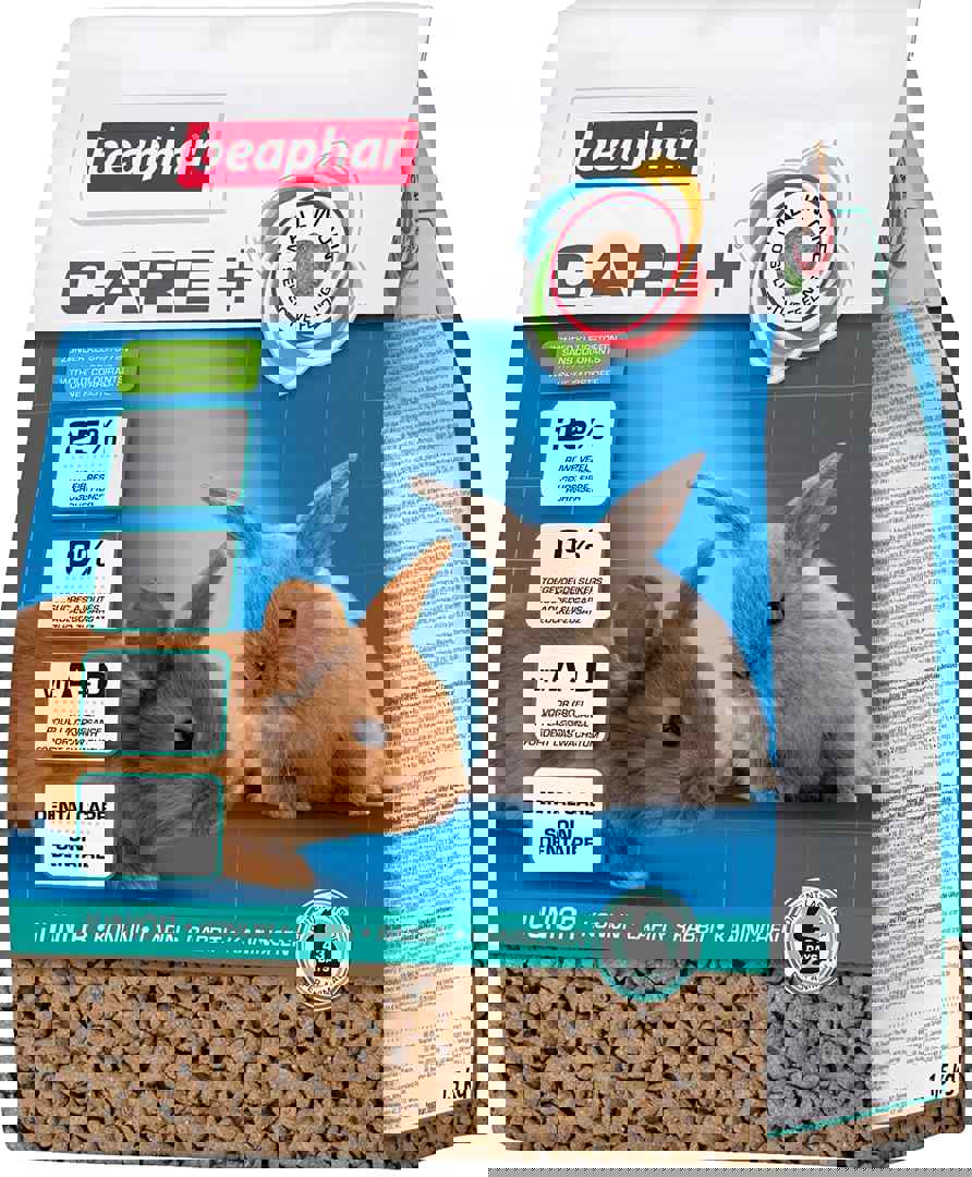 Beaphar Care+ Super Premium-Премиум храна за зайци 1.5 кг. Care+ е изключително добре усвояема и добре балансирана супер премиум храна, която е разработена съвместно с ветеринарни лекари, диетолози и експерти по отглеждане на зайчета. Произведено в Холандия от Beaphar B.V. Предлага се в разфасовки от 250 гр и 1.5 кг. Специален производствен процес чрез високо налягане и температура правят протеините лесни за усвояване. Всички вредни бактерии и вируси се елиминират от суровините при производствения процес като така се осигурява чиста и здравословна храна. Care+ съдържа протеини с висока биологична стойност за оптимален растеж. Тази храна има ниско съдържание на мазнини и съдържа Омега 3 и Омега 6 амино киселини. Също така са добавени ехинацея и спирулина.Специалната формула за предпазване на клетките чрез витамин Е осигурява здравето на клетките на вашия заек. Хелатните минерали, които са покрити в протеинова обвивка, увеличават абсорбцията. Добавени са FOS и MOS като пребиотици, които предпазват червата. Добавеният екстракт от юка намалява миризмата от екскрементите и урината в дома, така зайчето винаги има свежа околна среда и не пречи на никого. Разнообразието от съставки в Care+ осигурява зайците да бъдат здрави, жизнени и с осигурено дълголетие. Хранейки заека с Care+, можете да бъдете сигурни, че сте му осигурили най-добрата храна. Съвети за хранене: Зайчетата трябва да имат храна през целия ден, тъй като храносмилателният им тракт трябва да е винаги пълен. През първите няколко дни наблюдавайте как заекът приема храната и я смесвайте по малко със старата, ако е необходимо. Дневната дажба зависи от породата и теглото на заека. Давайте по толкова храна, колкото заекът може да изяде за един ден. В зависимост от породата заекът консумира от 60 до 450 грама на ден. Осигурявайте ежедневен достъп до прясна храна и вода. Не е необходимо да давате допълнително сено. Съдържание: зърнени продукти, зеленчукови продукти (Юка мин 0.2%, Еханицеа мин.0.05%), Протеин от зеленчуци, Зеленчуци(Фруктоолигозахариди мин.0.0076%), Минерали, Семена, Мляко и млечни про-дукти, Манан олигозахариди( от клетъчна обвивка на маята), Алги ( Спирулина мин.0.0075%).