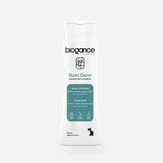 Шампоан Nutri Derm за кучета и котки с атопична кожа, базиран на зелена глина и бизаболол.