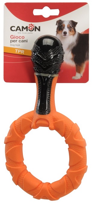 Camon dog toy - Играчка за куче TPR двуцветна топка с ринг и пищялка Забавна играчка за куче във формата на TPR двуцветна топка (черно и оранжево) с пръстен. Оборудван с вътрешен пищял. Размер - 26 см. 1 брой