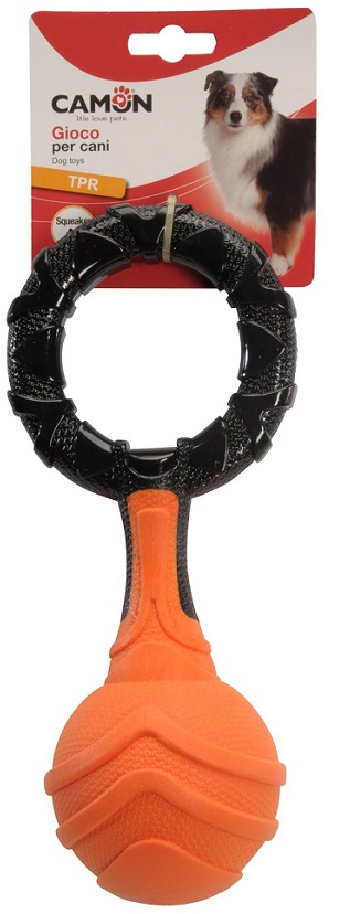 Camon dog toy Dumbbell - Играчка за куче - TPR двуцветен дъмбел с топка и пищял Забавна играчка за куче във формата на TPR двуцветен дъмбел (черен и оранжев) с топка. Оборудван с вътрешен пищял. Размер - 20 см. 1 брой