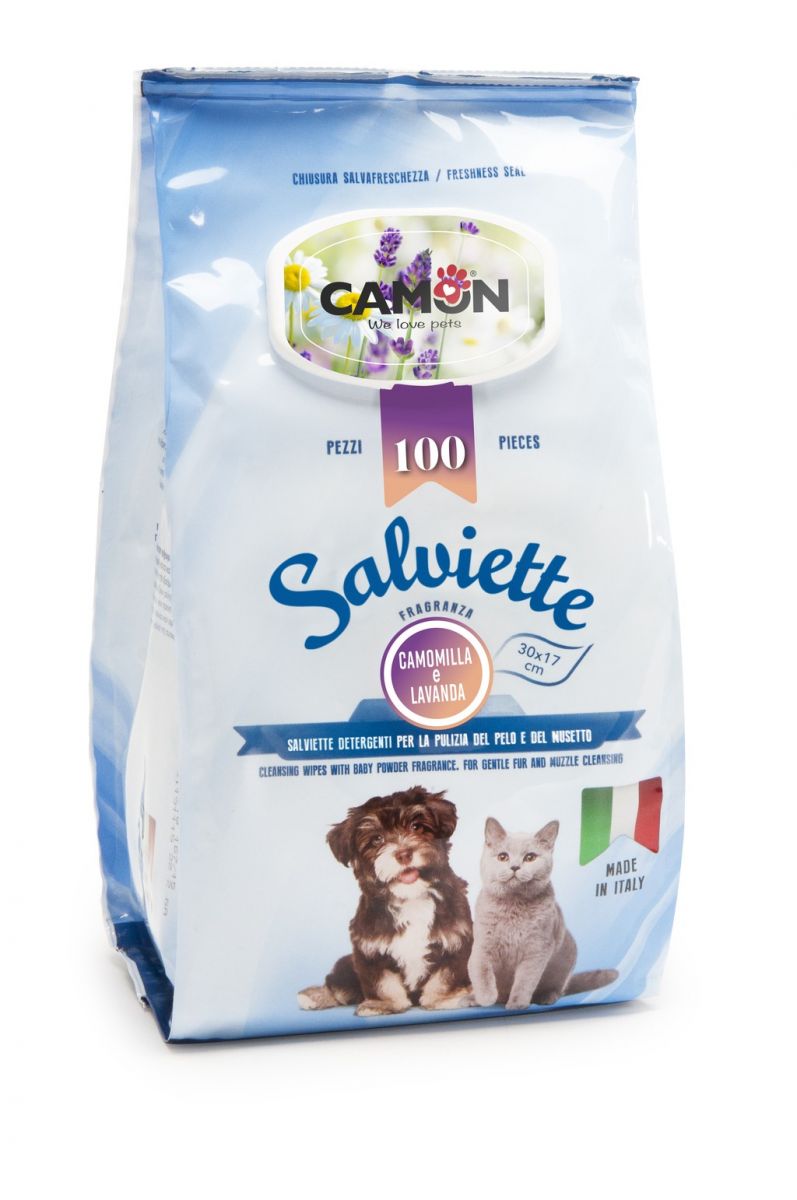 Camon Cleaning wipes Talc - мокри почистващи кърпички с талк за кучета и котки Винаги дръжте тези кърпички близо до себе си! Вкъщи или навън, те са идеално решение за почистване козината и лапите на Вашия домашен любимец, да контролирате миризмите, да почистите неговите уши и лице. Със своята естествена формула, те подхранват и предпазват козината.Начин на употреба: отворете пакетчето и извадете една кърпичка. Нежно почистете животното. Винаги затваряйте пакета след употреба. Размери: 30x20cm Опаковка: 40 бр.