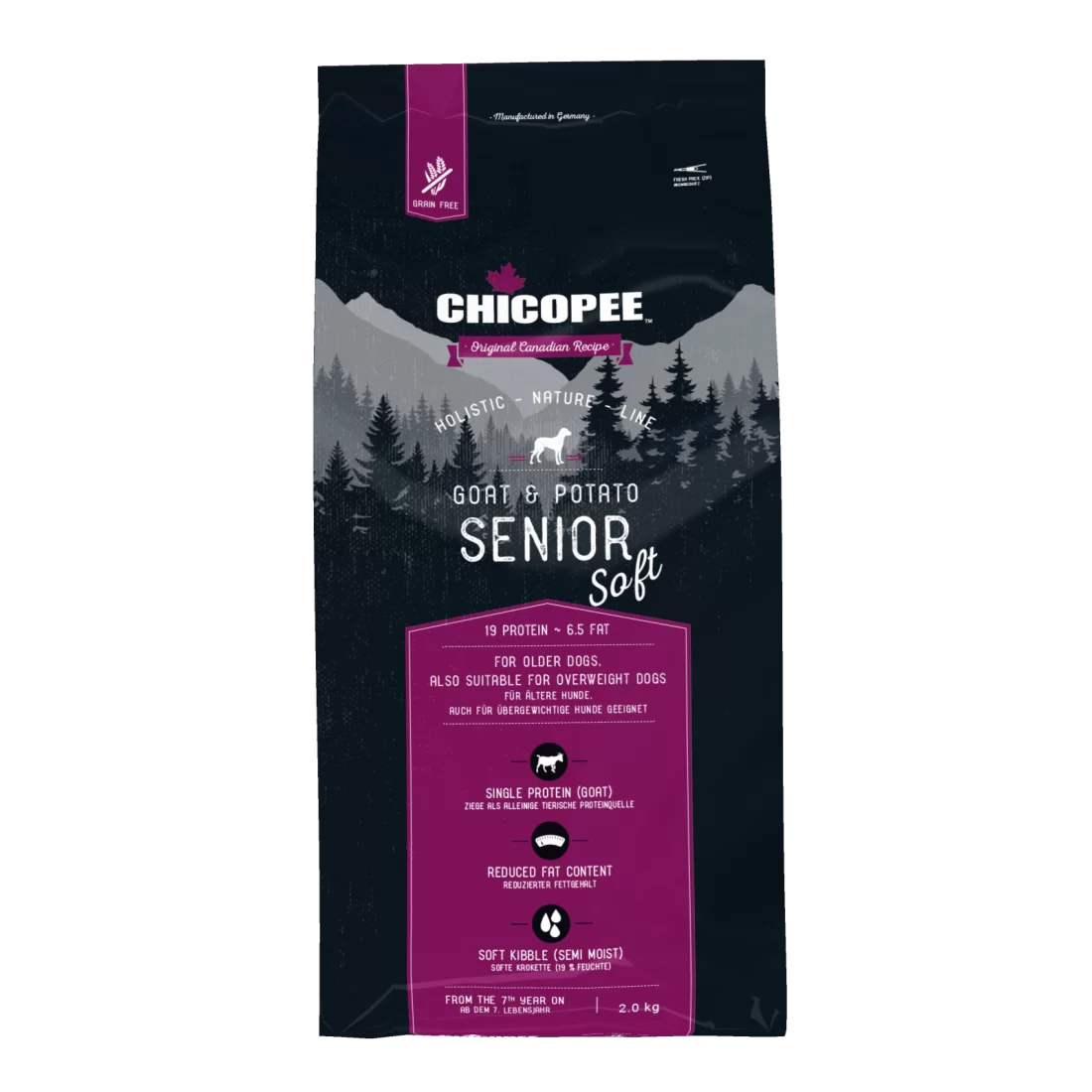 Chicopee Dog Holistic Nature Line Senior  е мека/полувлажна храна за възрастни кучета над 7 години с прясно козе месо (в съдържанието има и дехидрирано козе месо). Подходяща е и за кучета с наднормено тегло.