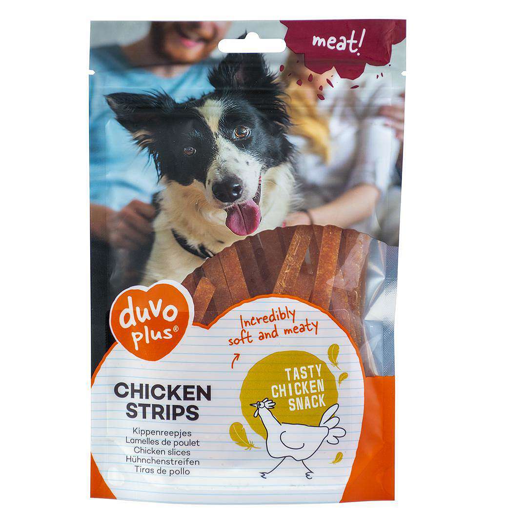 Duvo Chicken Strips - Вкусно лакомство за кучета, меки лентички чисто пиле CHICKEN STRIPS - Вашето куче заслужава най-доброто! Здравословно лакомство с пилешко месо за кучета Удобна опаковка за многократно отваряне и затваряне За кучета от 3кг и нагоре