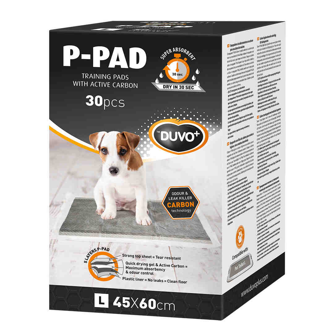 Този високо абсорбиращ Duvo + P-Pad с аромат на зелена трева може да се използва за домашно обучение на кученца и може да се използва перфектно като тоалетна за инконтинентни кучета или кучета, които са затворени за дълго време. Помага за обучението на вашето кученце в тоалетната: дръжте подложката на достъпно място. Поставете кученцето върху него след ядене и пиене и го възнаградете, когато е свършил бизнеса си с P-pad. Винаги бъдете търпеливи с вашето кученце, за да го насърчите винаги да прави бизнеса си, можете да използвате и спрея P-pad. Когато кученцето използва редовно P-Pad, премествайте P-Pad постепенно към вратата, докато излезе навън и кученцето си върши бизнеса там. Може да се използва и в кошници и развъдници. P-подложките се състоят от 5 слоя, горният слой е много износоустойчив и не се разкъсва. Вторият и четвъртият слой премахват неприятните миризми бързо и отделят свеж аромат на трева. Средният слой бързо превръща течността в гел, за да осигури сухи лапи. И петият слой е направен от здрав, синтетичен материал