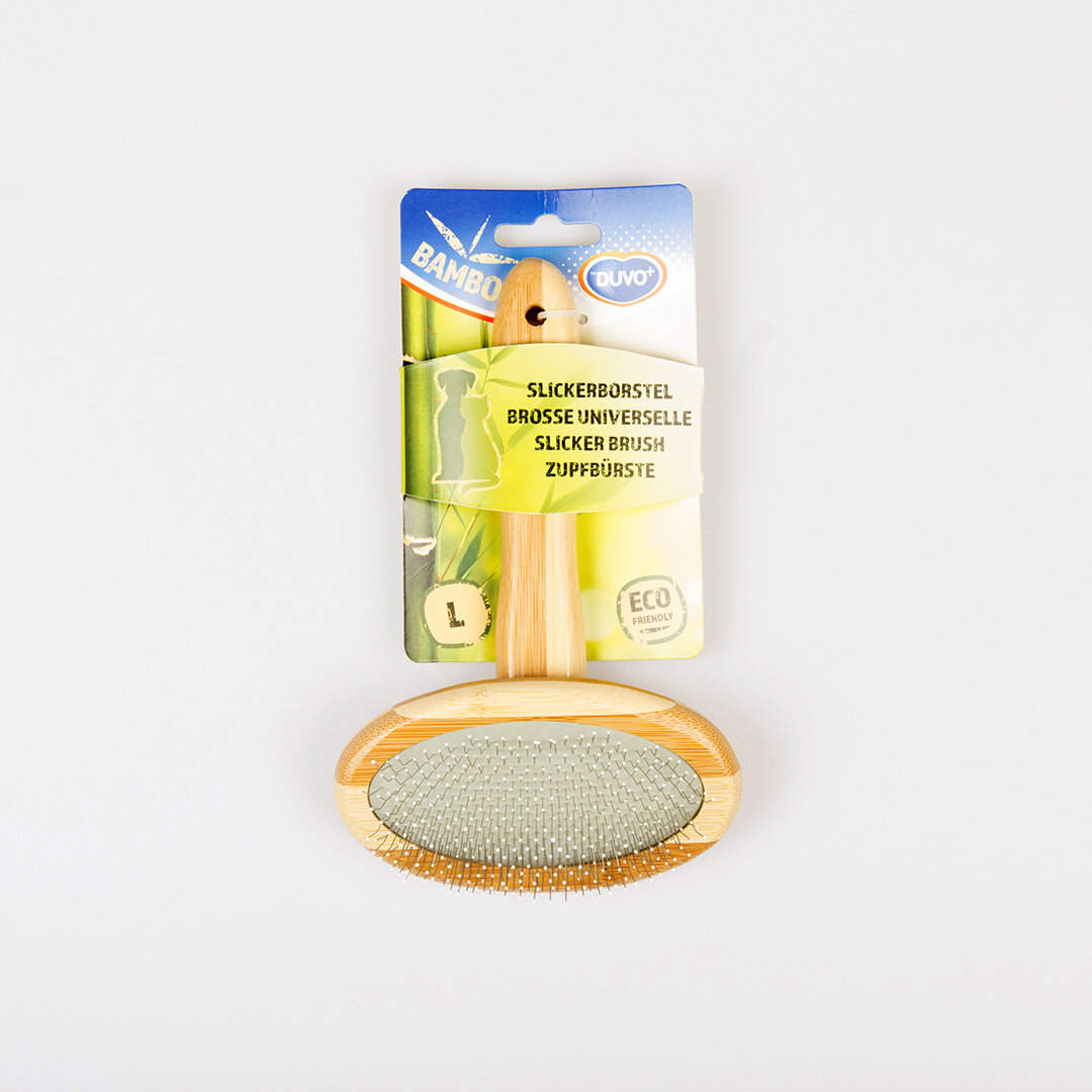 Duvo Plus Slicker Brush - Бамбукова чета за кучета и котки, за гъста, дълга или къдрава козина 19.5 /12 см. * Премахва излишните косми и заплитания * За внимателно изтъняване на подкосъма * Ергономична дръжка - изработена от екологичен бамбук * Идеален за дебела, дълга или къдрава козина Описание: С тази лъскава четка премахвате излишните косми и заплитания от козината на кучето. Много тънките и извити зъби също ви помагат внимателно да премахнете дебелия подкосъм без дразнене на кожата. Идеален за котки и кучета с дебела, дълга или къдрава козина. Ергономичната ръкохватка е направена от екологичен бамбук.
