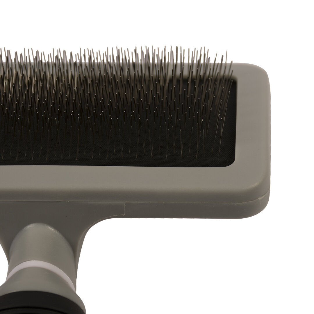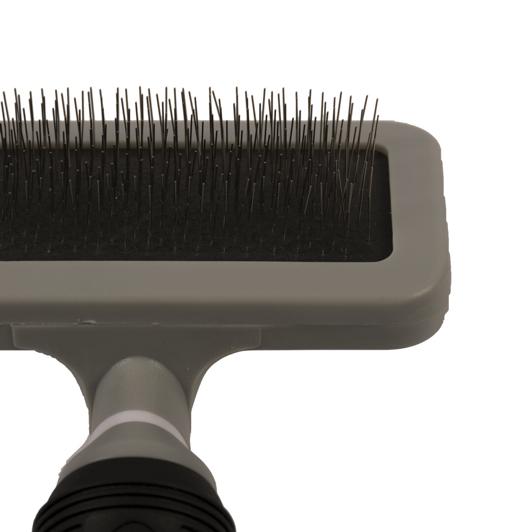 Duvo Plus Slicker Brush - Четка за кучета и котки за премахване на излишни косми и възли от козината С тази четка Duvo + Slicker, премахнете удобно излишните косми и възли от козината. Удобната триъгълна форма помага за четка на козината на трудни места, например под мишниците или зад ушите. Много тънките и извити щифтове нежно изтъняват дебелия подкосъм без дразнене на кожата. Изключително подходящ за котки и кучета с дебела, дългокосместа или добре навита козина. Четкайте редовно вашия четириног приятел, за да запазите палтото блестящо и здраво, а също така да имате по-малко работа в къщата и в колата. Ергономичната дръжка лежи леко в ръката и е изработена от трайна гума TPR.