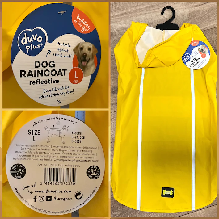 Duvo Plus Water- and wind-resistant rain coat Large - Кучешки дъждобран/ палто с качулка, 60 см. Водо- и ветроустойчив дъждобран за кучета Duvoplus кучешкият дъждобран е удобно водоустойчиво, ветроустойчиво палто с качулка за вашето куче. Изработен е от висококачествен материал и ще предпази вашето куче сухо в дъждовни дни. Жълтият дизайн със светлоотразителни ленти осигурява оптимална видимост както за кучето, така и за домашния настойник. Идеален за тъмните зимни дни! Палтото се облича лесно благодарение на велкро лентите.