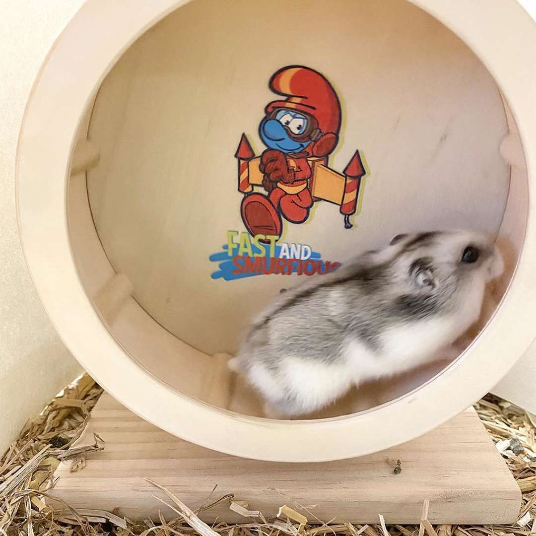 героите от новата поредица Смърфовете. Това дървено колело за упражнения с Jetpack Smurf е 100% безопасно за малки гризачи
