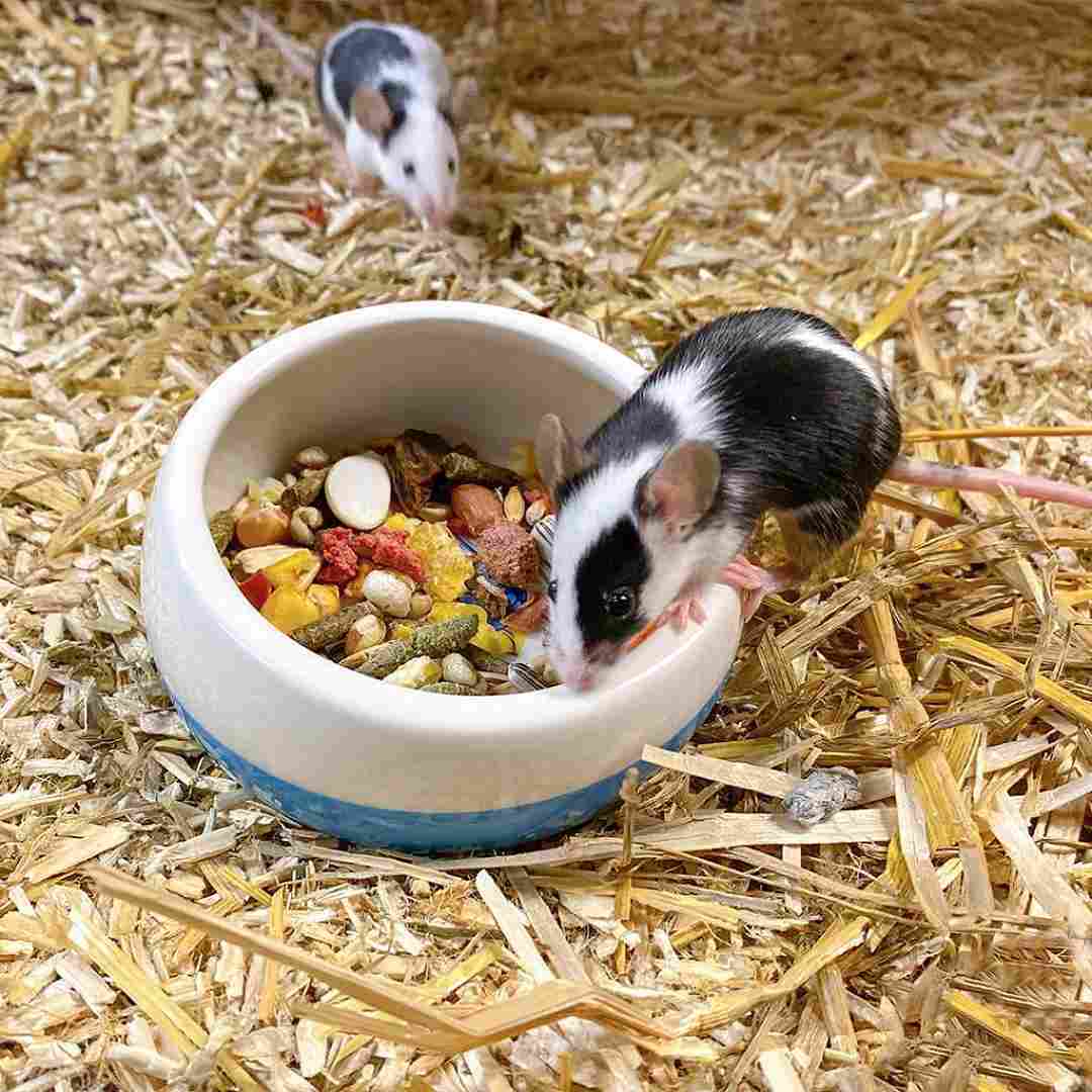 Практичен комплект за по-организирана и хигиенична клетка: две керамични купи (за храна/вода) + метална купичка с кука 150 мл + метална поставка за сено.