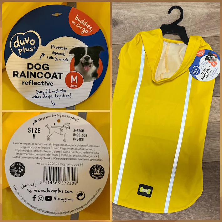 Duvo Plus Water- and wind-resistant rain coat Large - Кучешки дъждобран/ палто с качулка Водо- и ветроустойчив дъждобран за кучета Duvoplus кучешкият дъждобран е удобно водоустойчиво, ветроустойчиво палто с качулка за вашето куче. Изработен е от висококачествен материал и ще предпази вашето куче сухо в дъждовни дни. Жълтият дизайн със светлоотразителни ленти осигурява оптимална видимост както за кучето, така и за домашния настойник. Идеален за тъмните зимни дни! Палтото се облича лесно благодарение на велкро лентите.