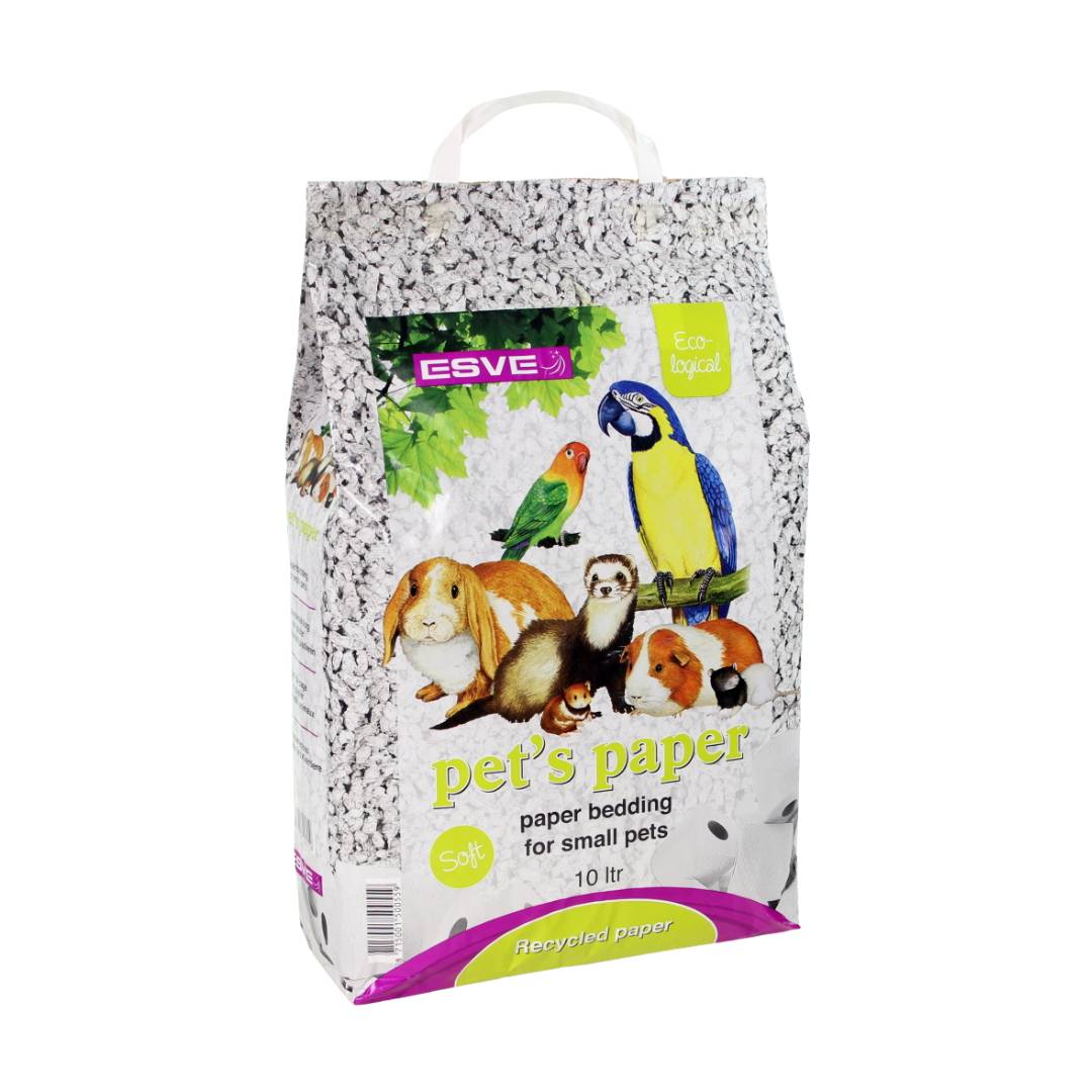 Esve Pet`s Paper постелка за дребни животни от рециклирана хартия е уникална силно абсорбираща постелка за домашни любимци, направена от рециклирана хартия. Използва се за зайци, гризачи, птици, порчета и екзотични животни. Гранулите Pet’s Paper са направени от неизползвани целулозни отпадъци от хигиенната индустрия (пелени, картон, хартия и др.), не съдържат прах и абсорбират три пъти собственото си тегло. Благодарение на високата скорост на абсорбиране (5 сек. 180%) тоалетната/клетката остава суха. Просто отстранявате използваните гранули (те набъбват и лесно се разпознават), така не се налага всеки път да заменяте цялото количество.