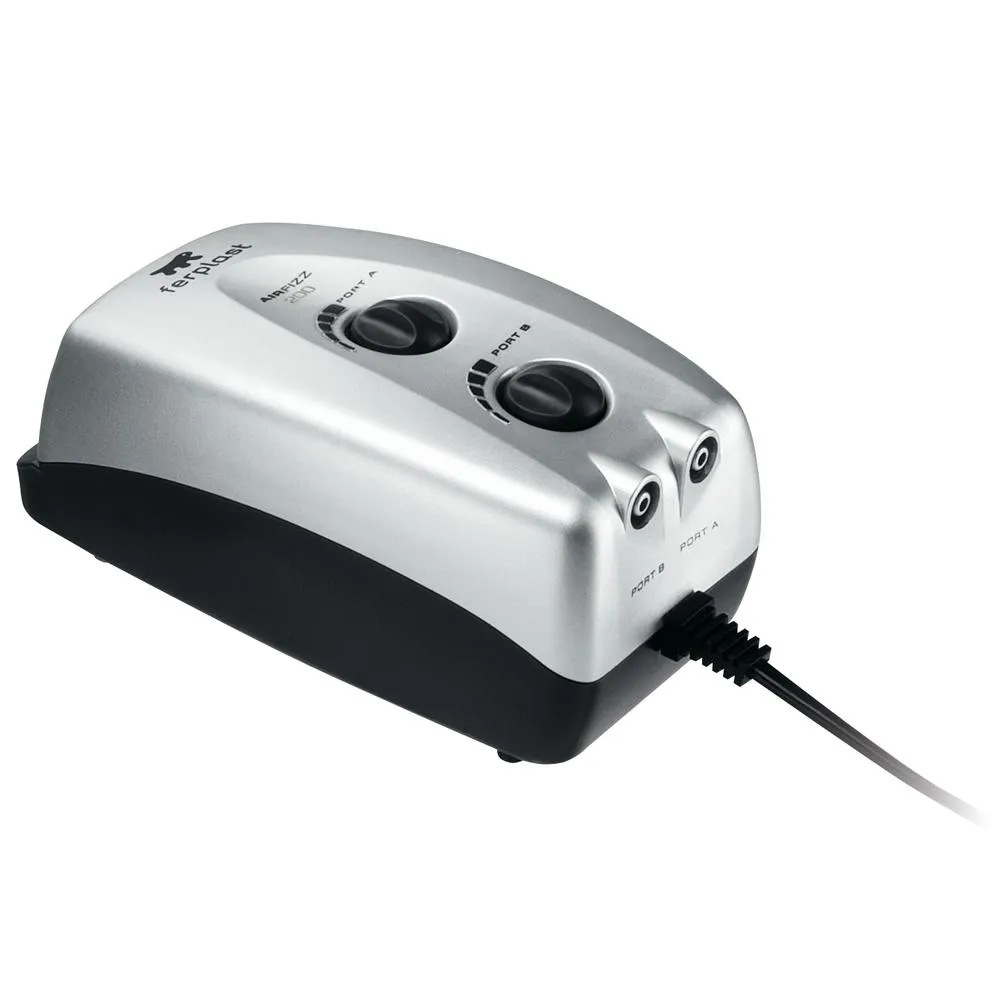 Ferplast - AIRFIZZ 400 Помпа за въздух - опаковка 1 брой За аквариуми до 400 литра Регулируем въздушен поток (по отделно) с две дюзи (2 x 200л/ч) Гумени крачета за намаляване на вибрациите Ниска консумация на енергия (5W) Размери: Широчина - 8.4см. Дължина - 16.5см. Височина - 7см