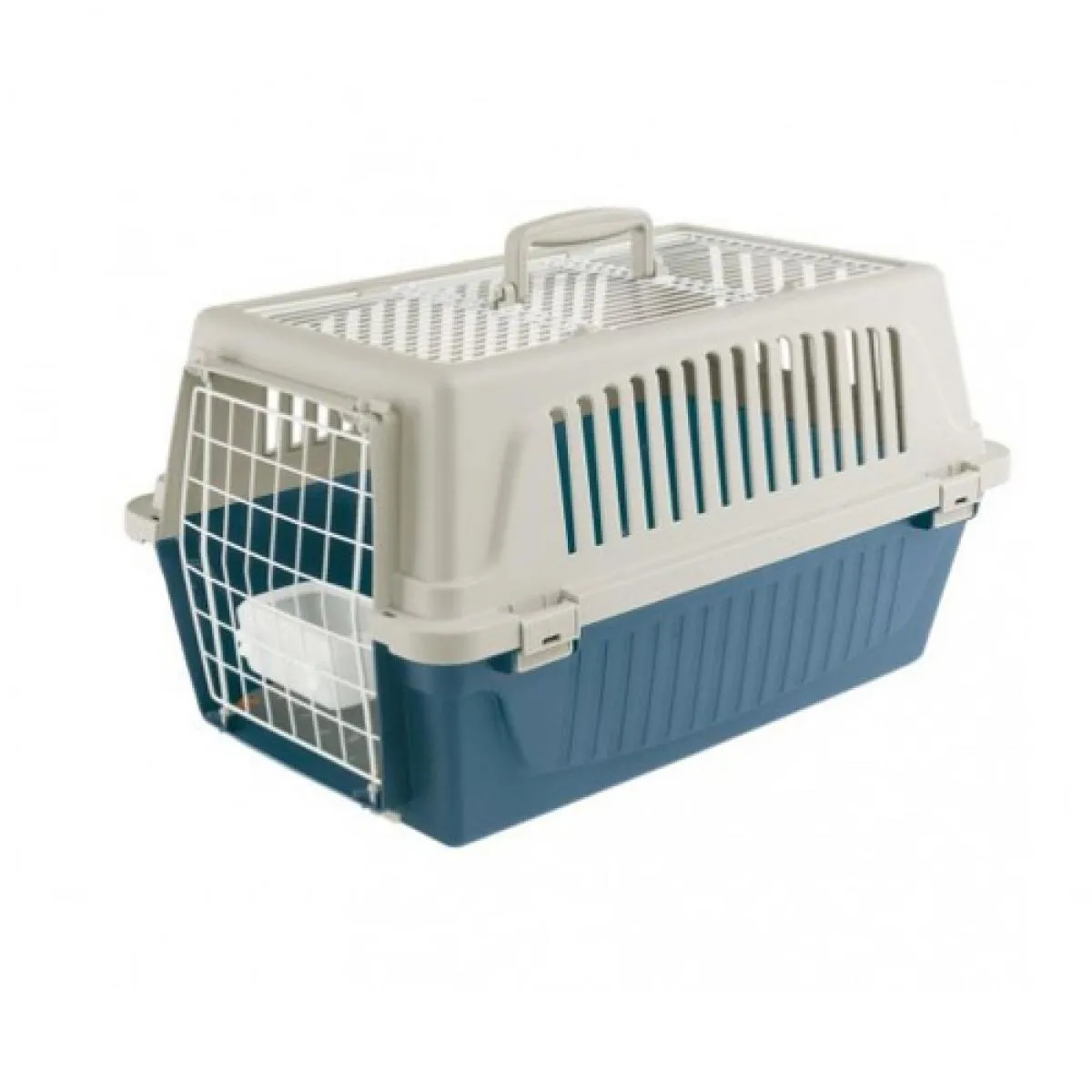 Ferplast - Atlas Deluxe 20 Open - Транспортна чанта за кучета и котки с мека постелка и съд за храна, 37,4 / 57,6 / 33 см. Atlas Deluxe Open е транспортна чанта идеална за малки кучета и котки. Подходяща за пътуване с влак, кола или самолет. Вратата е изработена от стомана с пластмасово покритие здраво закрепена към основа от пластмаса. Покривът може да бъде отворен, за по-добра вентилация, и възможност за проверка на домашния любимец. Има фиксирана оребрена дръжка за лесно пренасяне. Здравите странички закопчалки осигуряват бързо и ефективно заключване за по-голяма безопасност и за по-лесно почистване. Двойните отвори, на предната и горната част, осигурява лесен достъп до вътрешността на транспортната чанта за осигуряване на храна и вода за вашия домашен любимец (с включени пластмасова купа за храна и перяща се памучна възглавница. Препоръчително до 10 кг.