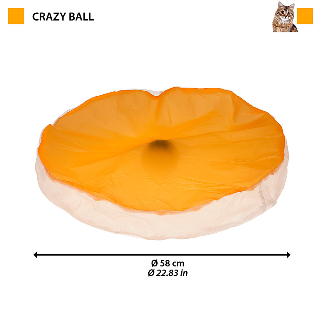 Crazy Ball се състои от найлонова чан,та със специално велкро за затваряне и топка, захранвана от батерия, с бутон за включване / изключване. Вътре в чантата топката се движи произволно, за да привлече инстинкта на ловеца на вашата котка.