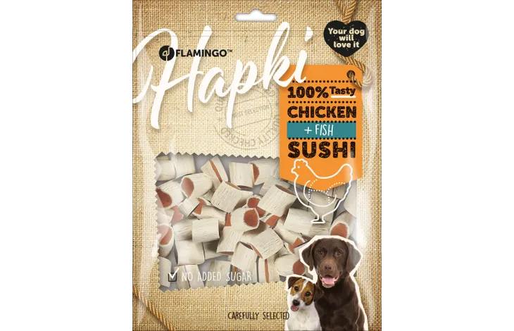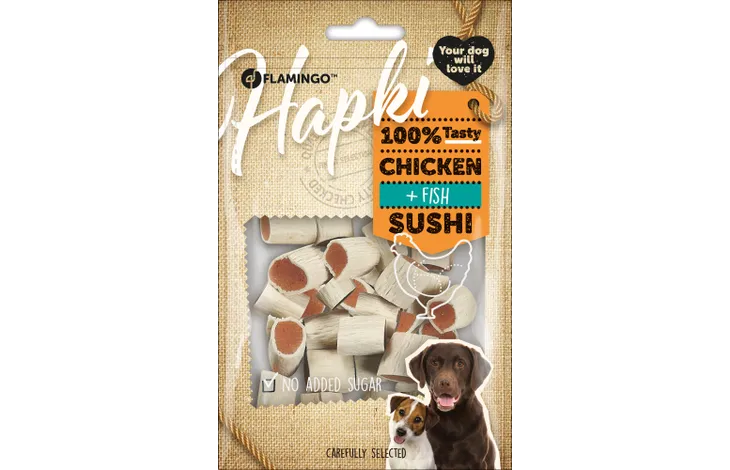Flamingo Chick N Fish Sushi - Лакомство за кучета, вкусни суши хапки с пилешко месо и риба Вкусно лакомство за вашия любимец. Ниско съдържание на мазнини. Високо съдържание на протеин.