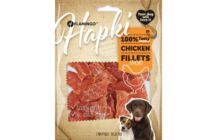 Flamingo Chicken Snack short - Лакомство за кучета, вкусни хапки с пилешко месо 100% ПИЛЕШКИ ФИЛЕТА Допълващ фураж за кучета Състав: животински продукти(пилешко месо 93. 9%), луковици, кореноплодни, глицерин, натриев хлорид. Анализ: протеин 60%; мазнини 3%; фибри 0, 3%; влага 18%