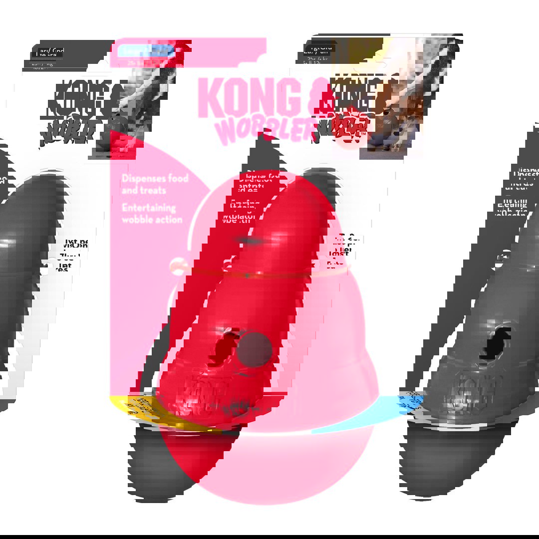 Kong Wobbler Small - Кучешка играчка за дъвчене с вътрешно пространство за лакомства 15 см. Играчка-дозатор за самостоятелна игра на кучета от големи породи. Използва се на закрито и се състои от 2 части, които са фиксирани с винтова връзка. Играчката е пълна със суха храна или някакво друго лакомство и кара домашния любимец да се замисли как да я получи. Може да се използва като метод за обучение на куче да отделя време, докато се храни, което е изпълнено с поглъщане на излишен въздух и последващ дискомфорт в храносмилателния тракт на кучето. Материалът е ярък безопасен полимер, получил одобрението на Администрацията по храните и лекарствата и може да се използва в хранителната индустрия. Играчката стимулира дейността на кучето и го поддържа във форма. Играчката е безопасна за съдомиялна машина. Отстранете внимателно опаковката преди първата употреба. Играчката не е предназначена за деца.