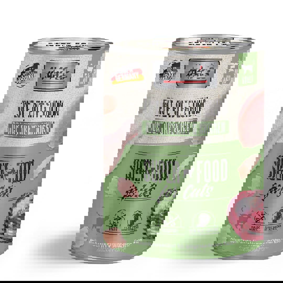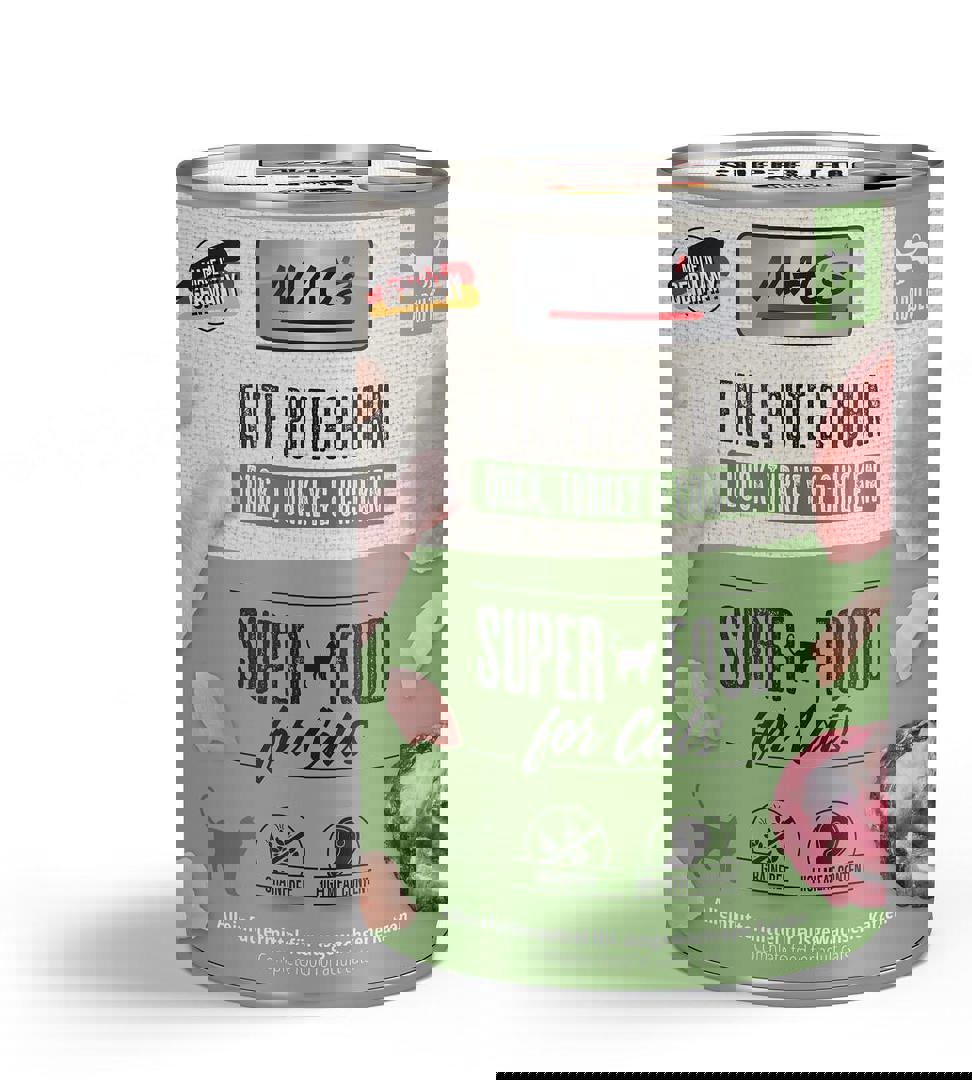 Mac’s Cat Патешко, пуешко и пилешко месо (мин. 70% месо) Състав: месо (мин. 25% пуйка, мин. 20% патица, мин. 25% пиле), животински субпродукти (черен дроб, сърце, шкембе), минерали и таурин. Анализ: протеини: 10, 6%, мазнини: 6, 9%, фибри: 0, 3%, пепел: 1, 9%, влага: 80%, таурин: 1000 мг/кг, витамин А: 2000 I. E/ кг, витамин D3: 200 I. E/ кг, витамин Е:   25 мг/кг. Производител: PRO PET KOLLER Германия.