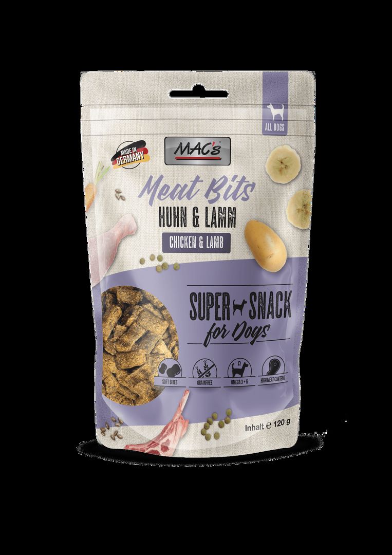 MAC'S DOG Meat Bits Chicken - Премиум лакомство, пауч за кучета, без зърно, хапки с пилешко месо. Пълноценна храна за кучета.Вкусна и полезна!Вкус: Пилешко месоБез зърнени култури.70 % месо.30 % плодове и зеленчуци.