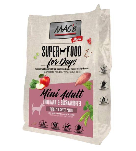 Mac's Dog Mono Mini е пълноценна храна за възрастни кучета с пуешко и сладки картофи. Специално адаптиран за дребни породи кучета със или склонност към алергии. Тази храна съдържа само един вид месо като източник на протеини и сладки картофи като източник на въглехидрати. Тази храна осигурява балансирано хранене и специално вкусово удоволствие за домашния любимец.