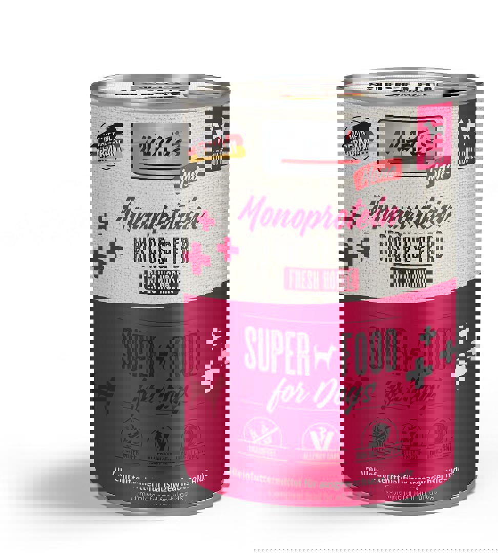Animonda Gran Carno SP Supreme Pure Horse - Консервирана храна за кучета с един източник на протеин конско месо. GranCarno Single Protein означава вкусно, здравословно, балансирано хранене - само един източник на животински протеини. Подходяща храна за възрастни кучета от 1 до 6 години.Суперхраните са ценен източник на специални хранителни вещества като фитонутриенти, антиоксиданти, минерали и микроелементи и по този начин могат да допринесат за благосъстоянието на кучето. Подбраните пресни, местни съставки гарантират уникалния вкус, който кучетата толкова много обичат.GranCarno Single Protein се произвежда без зърно, соя, захар, подобрители на вкуса, изкуствени оцветители или консерванти. Той осигурява всички основни хранителни вещества, от които се нуждае едно куче. Състав: 65% кон ( бял и черен дроб, месо, сърце), калциев карбонат, натриев хлорид.Аналитичен състав: протеин 11. 5%, мазнини 5. 5%, фибри 0. 5%, пепел 2. 5%, влага 78%.