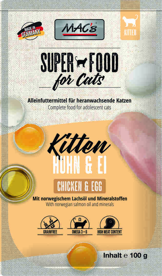 Mac's Super Food For Cats - Премиум пауч за подрастващи котки, без зърно, с пилешко месо и яйца. Премиум пауч за вашия любимец.Без зърнени продуктиС Омега 3 и 6Високо съдържание на месоС масло от норвежка сьомга и минерали