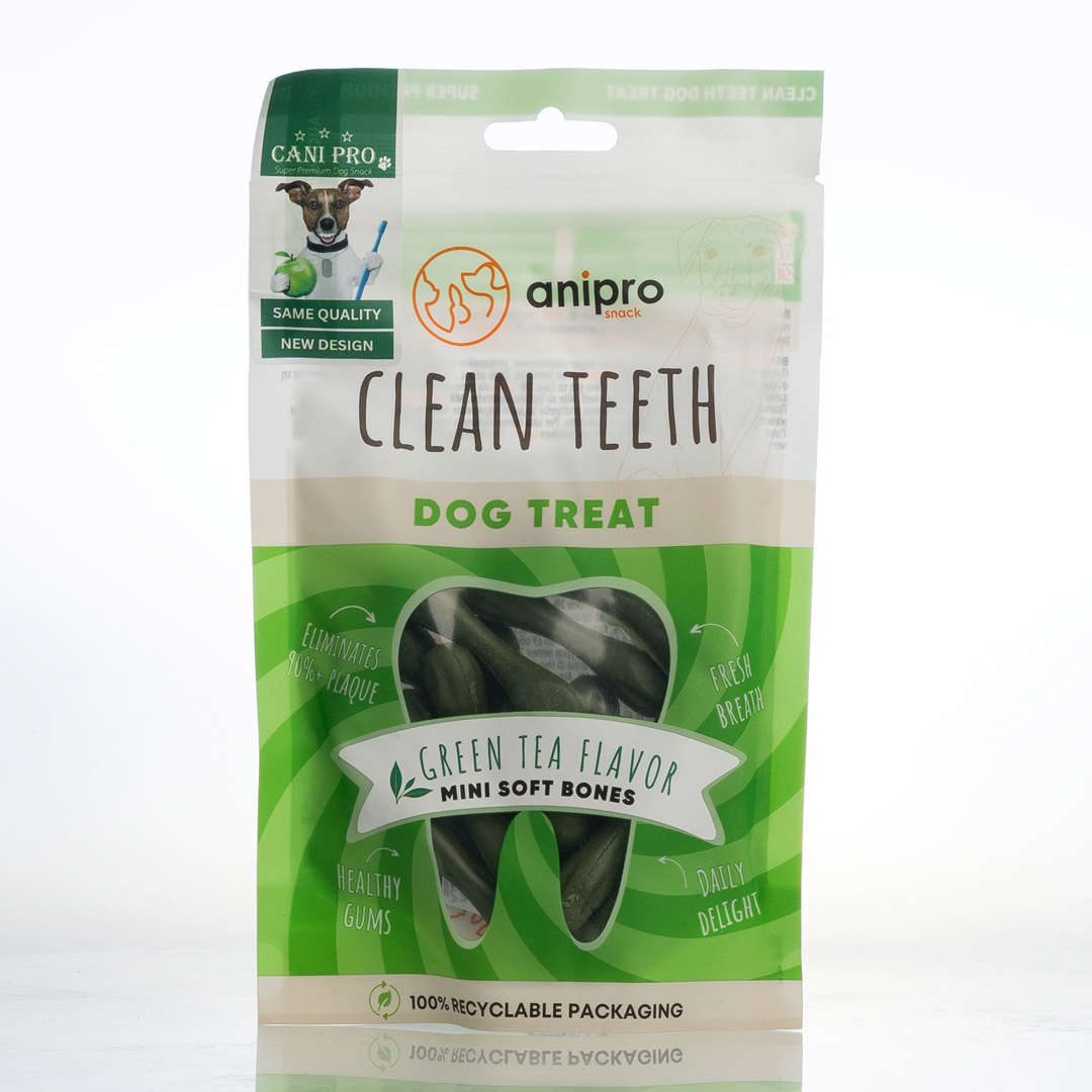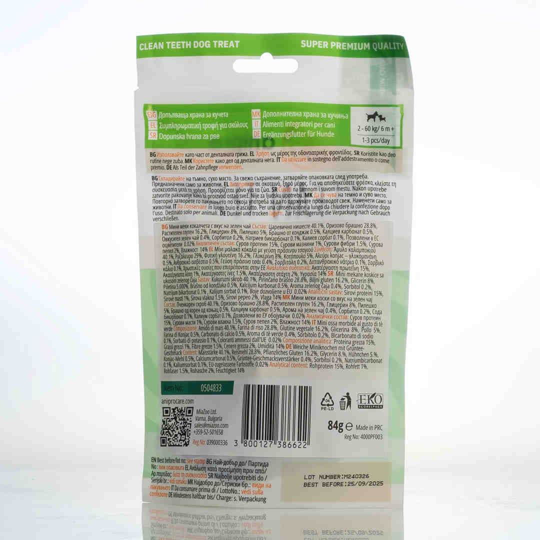 Anipro Dental - Кучешко лакомство дентални мини кокалчета с пиле. Дентални мини кокалчета с аромат на пиле, които освежават дъха и заздравяват зъбите. Съдържат съставки, подсилващи имунната система. Елиминират 90% от плаката и предпазват от натрупване на нова. Предлагат е в опаковка от 84гр с прозорче, с цип и дупка за закачане. Съдържат масло от магданоз, корен от Konjac, калциев карбонат, хлорофил и натриев бикарбонат (сода). Не съдържат H2O2 и кожа.