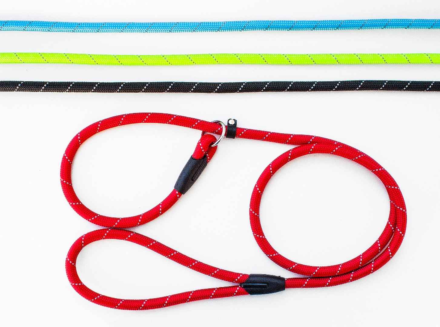 Различни цветове поводи от въже с метален обков, произведени от МиаЗоо в България.