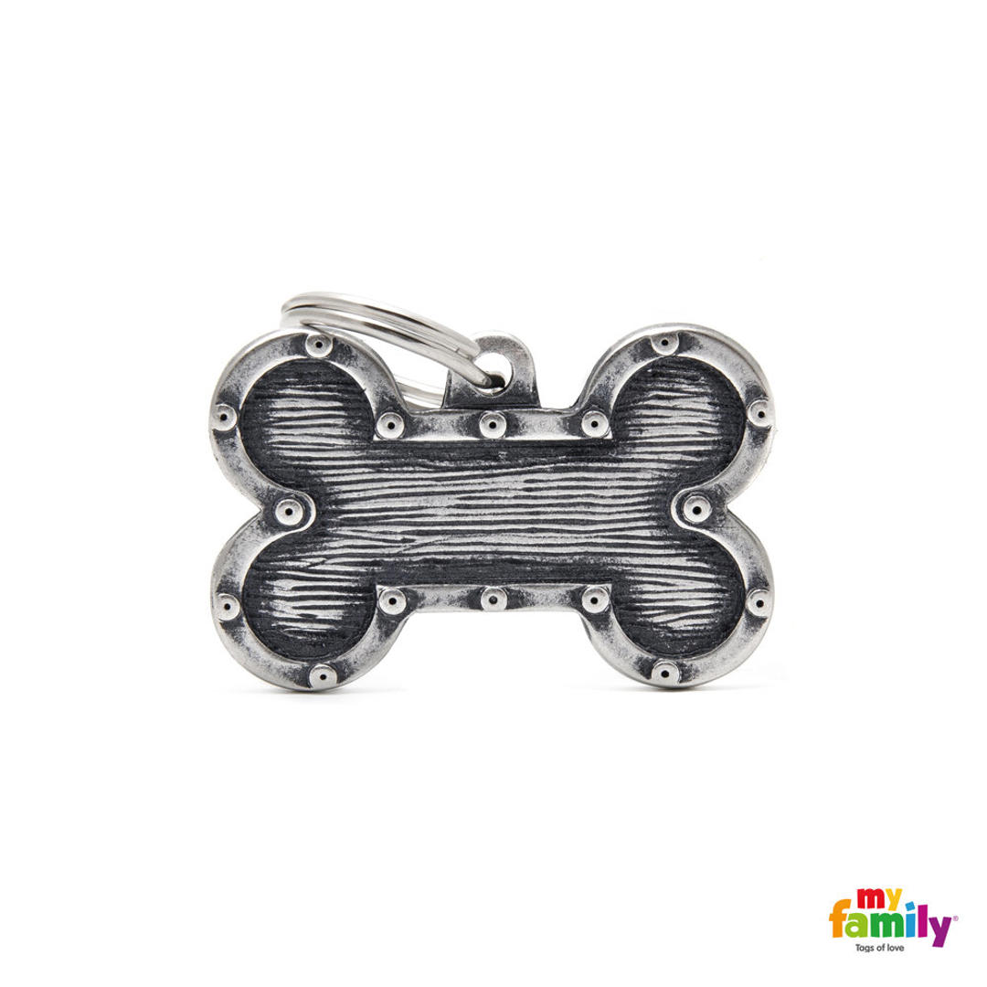 My Family Bronx Dog Tag Big Bone Futuristic - Ръчно изработен медальон кокал - адресник за кучета Всеки артикул от колекцията на Бронкс е уникален пример, завършен на ръка и усъвършенстван с модно антично сребърно покритие. Малките неравности по повърхността на етикетите са доказателство за ръчно изработения процес, който ги прави автентични продукти. Колекцията на Бронкс се характеризира с няколко тъкания и декорации, които разпространяват истинската градска душа на американските предградия. Произведено в Италия Характеристики на Bronx ID Tags: - Материал: Zamak антично сребърно покритие - Размер: 3,80 х 2,50 см. - Безплатна персонализация - Оборудван с пръстен