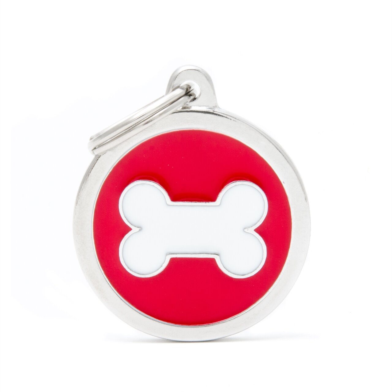 My Family Dog Tag - Ръчно изработен кръга адресник с кокал , за кучета 3.93 см/ 3.17 см. червено бял