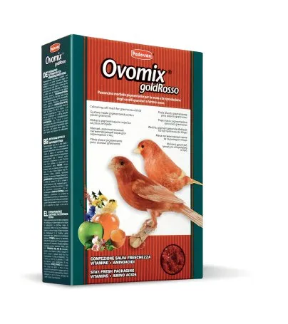 Padovan Ovomix gold хранителна добавка за птици - червена, 300 гр. Характеристика Padovan Ovomix gold хранителна добавка за птици - червена, 300 гр. е вкусна и полезна. Вашите любимци ще се влюбят във вкуса й. С нея можете да храните както малки, така и възрастни птици. Състав пшенично брашно соя бисквити мая минерали хранителни оцветители ябълки яйца зехтин, растително масло минерали (калциев карбонат) оцветители антиоксиданти естествени аромати витамини DL-метионин 40 мг / кг. L-лизин 40 мг / кг.