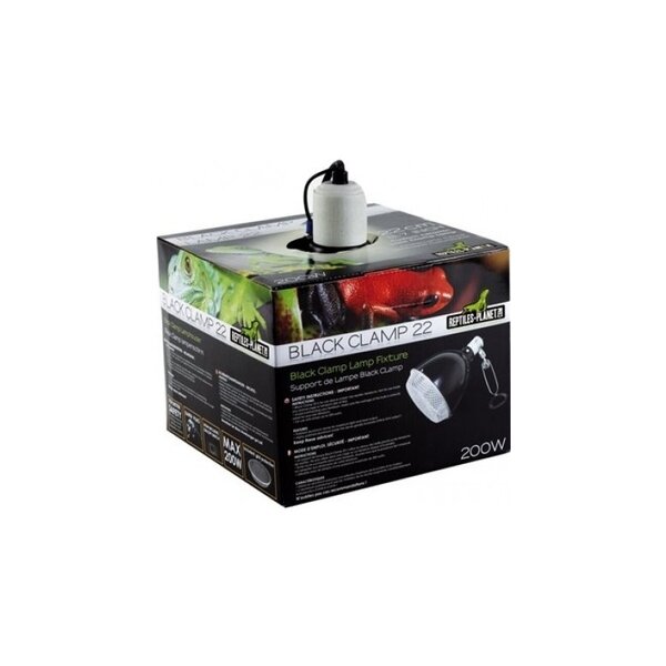 Black clamp lamp е предназначена да се използва вътре в вивариума или терариума, като използвате приложената скоба,или за монтиране на капака на вивариума или терариума. Черният цвят от външната страна, отразява бял интериор. Плафониерата може да поддържа всеки тип за осветление или отопление. За да изберете Black clamp 25 за монтиране на вивариума или терариума си, моля проверете таблицата за съвместимост и изберете правилния размер. Максимална мощност: 200 W за Black clamp 25 Предлага се и защитна мрежа в два размера (15 и 25 см), проектирани специално, за да се адаптират към Black clamp 25 .