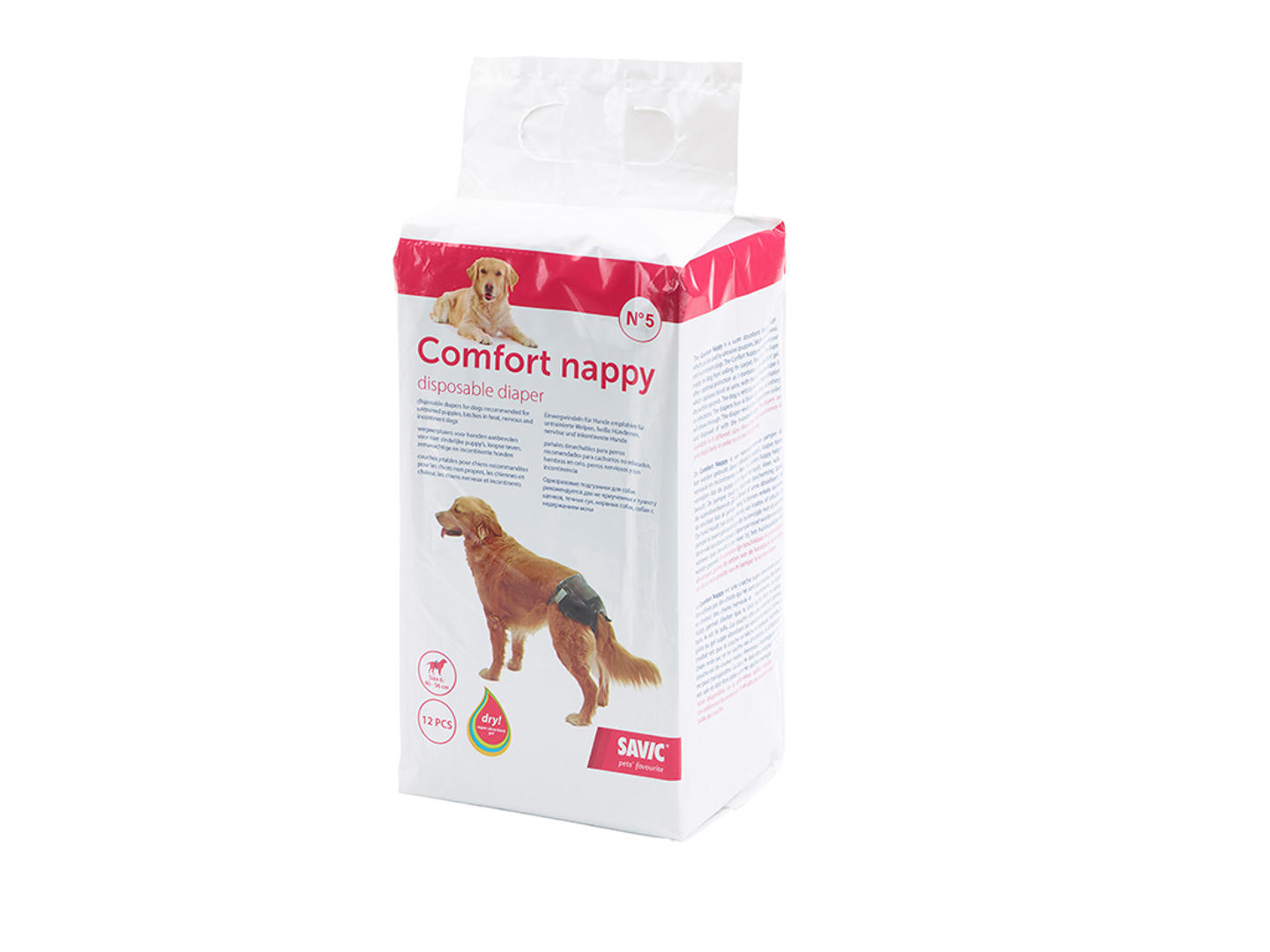 Savic Напи- Памперс за кучета Комфортни памперси, които предлагат оптимална защита както за малки кученца, така и за израснали кучета. Препоръчват се при малки и необучени кученца, разгонени кучета, нервни и невъздържани кучета. Чрез използването на памперса вие ще избегнете замърсяване на под, килими, дивани и др. Изхвърляйте заедно с битовите отпадъци, НЕ МОЖЕ да се изхвърля в тоалетна. Размери: Памперс куче Напи T5 42-52см, 12 бр.