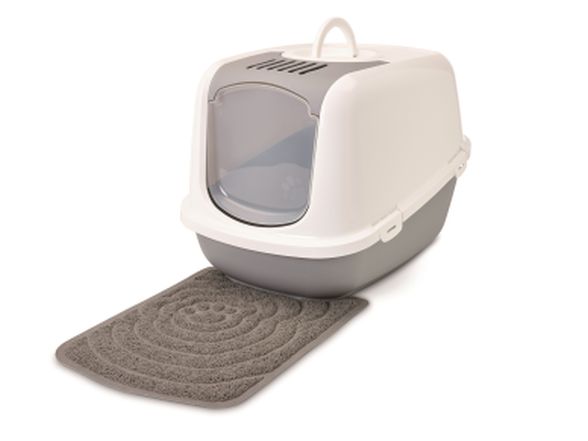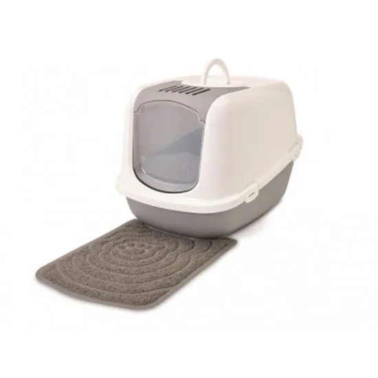 Duvo Plus Cat Litter Mat Half-Round - Котешка постелка за пред тоалетната 60x37 см. сива * Чудесно улавя частиците котешка тоалетна * Лапите са винаги чисти * Без хлъзгане * Лесна за почистване Проблем, познат във всяко домакинство с котка: частици от постелката на котешката тоалетна се разнасят из цялото жилище. С килимчето за котешки тоалетни този проблем остава в миналото. Килимчето е извънредно широко и за повече ефективност покрива обширно пространство около тоалетната. Състоящата се от пластмасови нишки повърхност е мека и приятна на допир. В резултат на това килимчето е оптимално и за чувствителни котки. Изхвърчалите при ровене частици от постелката попадат върху килимчето и се закачат за него. При преминаването на котката по килимчето то обира и отпадъците, залепнали за лапите на Вашата домашна любимка. При това повърхността се усеща много приятна и топла на допир. Можете да почистите килимчето с прахосмукачка или просто като го изтърсите. Полепналите по него отпадъци се отстраняват безпроблемно и килимчето отново е чисто.