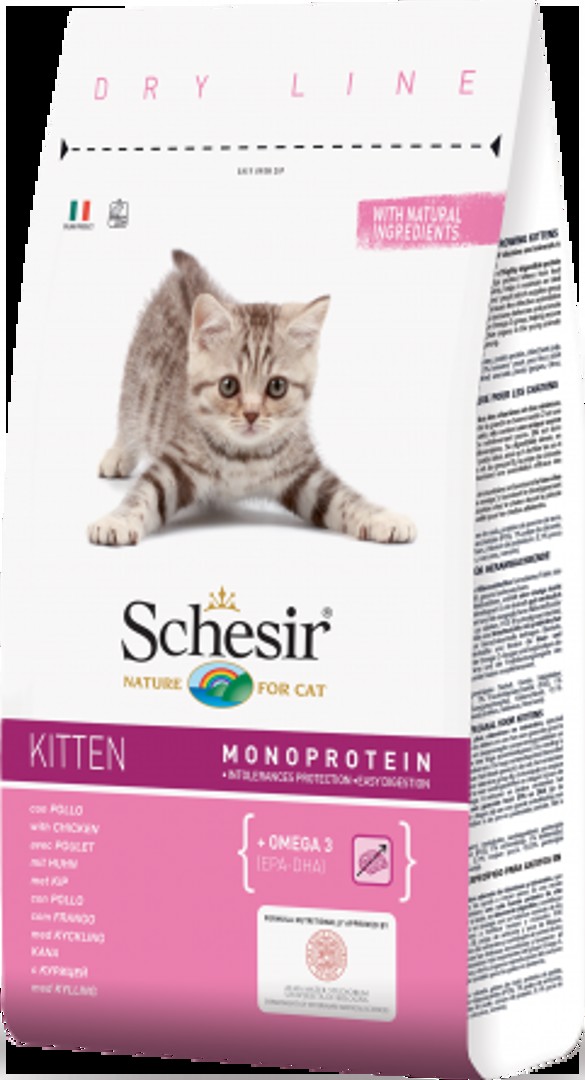 Храна за котка Chicopee Classic Nature Line Kitten е подходяща за котета до 12 месеца. За индивидуален растеж; За оптимално храносмилане; Рецепта без пшеница. Съдържание: Протеини от домашни птици (сушен, 30%), пилешки протеин (сушен), царевица, сорго, мазнини от домашни птици, хидролизиран протеин, грах (сушен, 1.5%), черен дроб (2% ), цикория (изсушена, 0.5%), ленено семе (0.5%), калиев хлорид. Аналитични съставки: Протеин Съдържание на мазнини Сурови влакна Сурова пепел Kалций Fосфор Mагнезий Добавки: Хранителни добавки / kg Витамин А Витамин D3 Витамин Е Биотин Таурин Микроелементи Цинк (катоцинковоксид) Мед (меденсулфат, пентахидрат) Йод (катокалциевйодат, безводен) Селен (катонатриевселенит) Опаковка 1.5 кг
