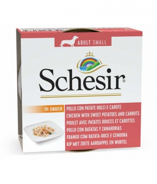 Schesir - Консервирана храна за кучета с пилешко в собствен сос, 85 гр. Schesir се ангажира да използва 100% натурални съставки Всички съставки са варени на пара и приготвени на ръка Всички продукти на Schesir са формулирани без добавени консерванти или оцветители Без жестокост Опаковката е 100% рециклируема Идеална порция за малки кучета