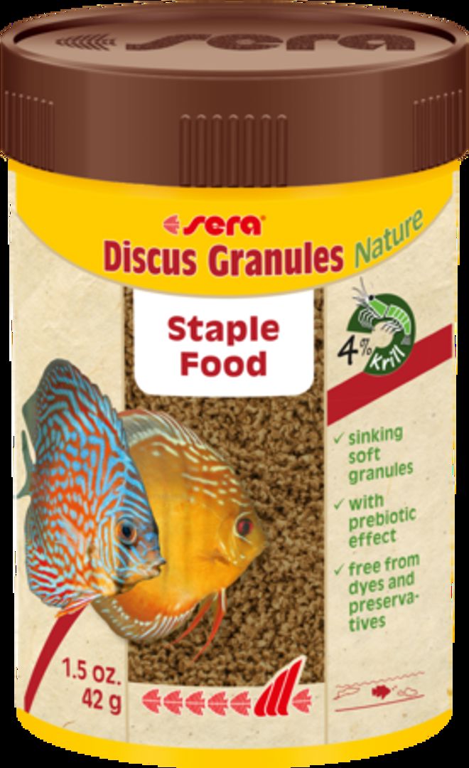 Sera Discus Nature - Пълноценна храна за всички дискуси и други цихлиди, 12 гр. Пълноценна храна за всички дискуси и други цихлиди. Съдържа: рибно брашно, пшенично брашно, брашна от миди и ракообразни, брашно от скариди, бирена мая, спирулина, масло от херинга, масло от дроб треска. Предлага се в разфасовки от 12 гр и 100, 250, 10 000 мл.