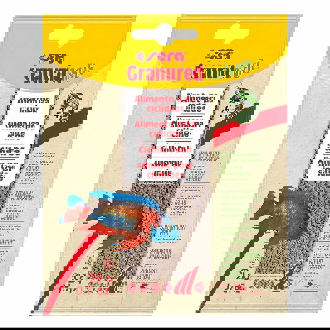 Sera Granured Nature е храна за цихлиди, например от езерата Малави или Танганайка, които се хранят предимно с безгръбначни. Предлага се в разфасовки от 20 гр. и 250, 1 000 мл. Високоенергийна храна за цихлиди.