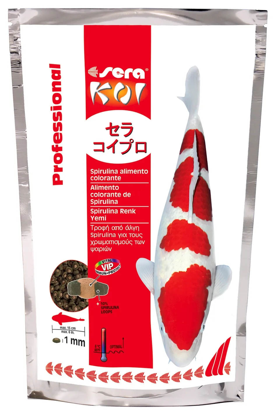 Sera koi Professional spirulina food-Храна за риби Кои със спирулина,хранете при температури на водата над 8° 7кг. Sera koi professional Spirulina food е новата ко-екструдирана храна за кои. С тази иновация сера успя да комбинира различно обработени съставки в един продукт, което подсигурява специфичните нужди при храненето на коите при различни температури на водата. Sera koi professional Spirulina food е натурална оцветяваща храна за кои и други езерни риби. Пръстен: Осигурява прекрасни цветове благодарение високото съдържание на спирулина и морски алги. Ядро: Произведено по специален ниско температурен процес с формула за жизнена защита + витамин С, които осигуряват устойчивост към болести и редуцират податливостта към тях. sera KOI Professional Spirulina Color Food придава копринен блясък, чист цвят и предотвратява образуването на жълти петна по белите части на коите. Тази храна е подходяща за хранене през цялата година. Високата ѝ устойчивост във водата и усвояемост гарантира по-малко замърсяване на водата. Инструкция за хранене: Хранете при температури на водата над 8°С, но по толкова, колкото рибите изяждат за кратко време. Не прехранвайте. Съдържа: рибно брашно;царевично нишесте;брашно от пшенични зародиши;бирена мая; Спирулина брашно; брашно от морски алги Haematococcus; брашно от ракообразни, брашно от царевичен глутен; ;брашно зелено устна мида; брашно от коприва; брашно от пипер; мадганоз брашно;люцерна брашно; моркови брашно; рибно масло;витамини. Добавени витамини:Вит А 17.300 IU; Vit D3 900 IU; Vit E 54 IU, Vit B1 14 mg; Vit B2 41 mg; Vit C 250 mg. Затваряйте плика след употреба, съхранявайте на хладно и сухо място. Гарантиран анализ: мин. суров протеин: 38%;мин. сурови мазнини 7 %;макс. Влага 6%;мин. Пепел 6.5%; макс. сурови фибри 4 %