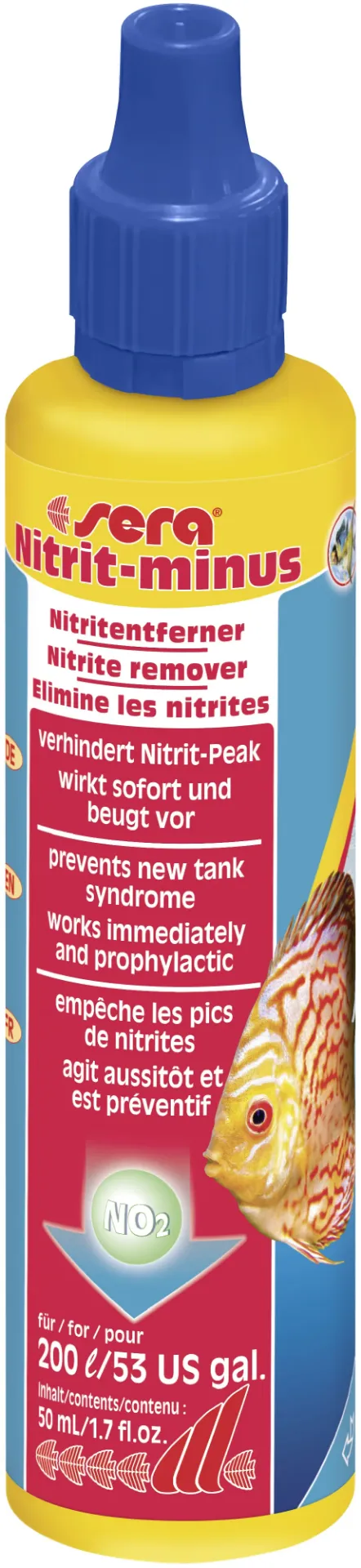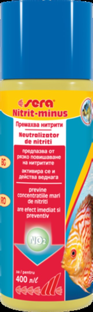 Sera Nitrit-minus- Препарат за премахване на нитрити 100 мл. Този препарат предпазва от рязко повишаване на нитритите. Активира се и действа веднага - незабавна помощ срещу нитрити. Предотвратява синдрома на новия аквариум. С една доза незабавно премахва 1.5 мг/л нитрити от водата. Предпазва от опасно, рязко повишаване на нитритите и оказва незабавна помощ в случай на замърсяване. Токсичните нитрити са разградени до органични амини, които се усвояват от бактериите. Добре се приема от риби, безгръбначни и растения. Препоръчителна доза: Добавяйте 5 мл от Nitrit-minus на всеки 20 л. вода срещу 1.5 мг/л нитрити. Дозирайте до 5-ия и 15-ия ден по време на биологичното активиране. Винаги проверявайте параметрите на водата и я аерирайте добре. Да се пази от деца и домашни животни.