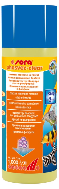 Sera Phosvec clear - Премахва минерална мътност и фосфати в аквариуми, 250 мл. Sera Phosvec Clear ще ви помогне да поддържате дълготрайно кристално чиста вода. Той премахва минерално помътняване и фосфатите - основен хранителен елемент на водораслите. Чиста гледка: Премахва минерално помътняване; Премахва фосфатите основен хранителен елемент на водораслите; За дълготрайно кристално чиста вода.