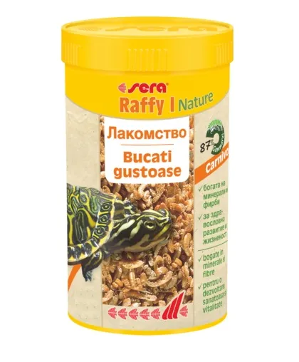 Sera Rafi I Nature - Основна храна за костенурки 250 мл. Висококалорична основна храна за костенурки и месоядни влечуги. Предлага се в разфасовки от 100, 250 и 3 600 мл. Sera Raffy I Nature се състои от добре балансирана смес от гамарус, дребни скариди, аншуа, богати на калций и минерали. Може да се използва и за сухоземни костенурки и гущери. Препоръчваме комбинирано хранене със Sera Raffy P. Анализ: суров протеин 52.7 %, сурови мазнини 5.4 %, сурови влакнини 7.8 %, влага 10.8 %, сурова пепел 22.6 %. Произведено в Германия от Sera GmbH, Heinsberg.