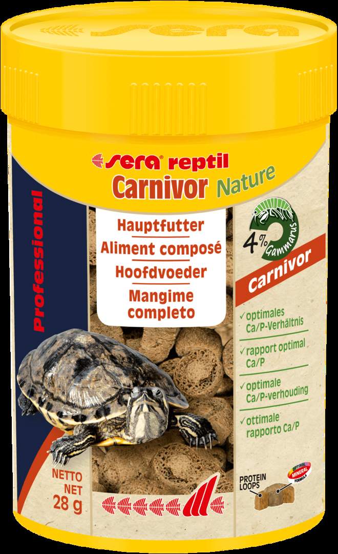 Sera Reptil Professional Carnivor-Храна за костенурки и други месоядни влечуги 1000 мл. Професиона ко-екструдирана храна за месоядни влечуги! Чрез този начин на производство чувствителните витамини и жизнени съставки се обработват отделно от протеините с щадящ нискотемпературен процес. Храната се състои от два слоя - външен кръг с висококачествени протеини и мазнини и сърцевина с необходимите витамини и минерали, както и морски водорасли за повишаване устойчивоста на болести. Оптималното съотношение калций/фосфор води до здравословен растеж и здрави кости и черупка. Предлага се в разфасовки от 100, 250 и 1 000 мл. Съдържание: риба, царевично нишесте, гамарус, ракообразни, миди, морски водорасли, рибно масло, витамини, оцветител. Добавени: Вит.А 38.000 IU/кг., Vit.D3 2.000 IU/кг, Vit.E 120 мг/lb., Vit.C 550мг/кг. Гарантиран Анализ: Суров протеин 38 %, сурови мазнини 8 %, сурови влакнини 5 %, влага 5.5 %, сурова пепел 8 %, макс.калций 2 %, мин.фосфор 1 %. Произведено в Германия от sera GmbH, Heinsberg.